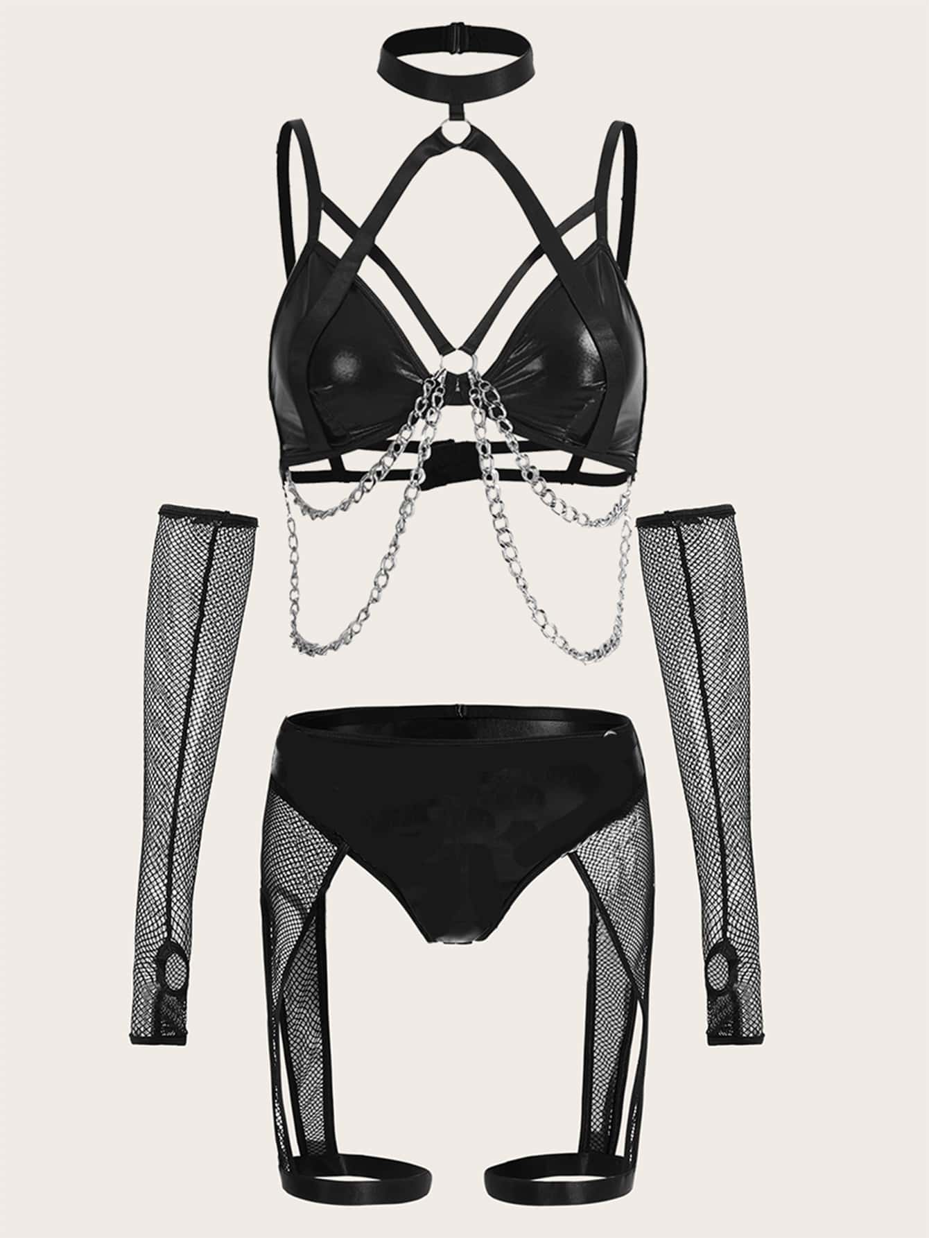 Grunge Punk 4pack Chain Detail Harness Garter Lingerie Set With 1pair Oversleeves