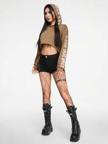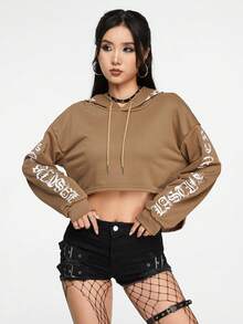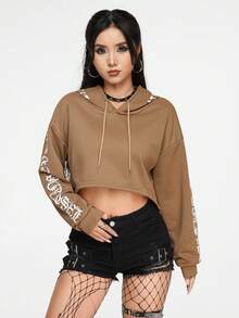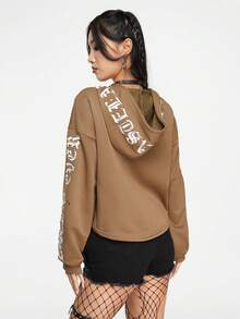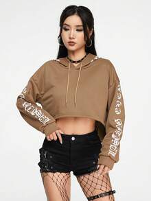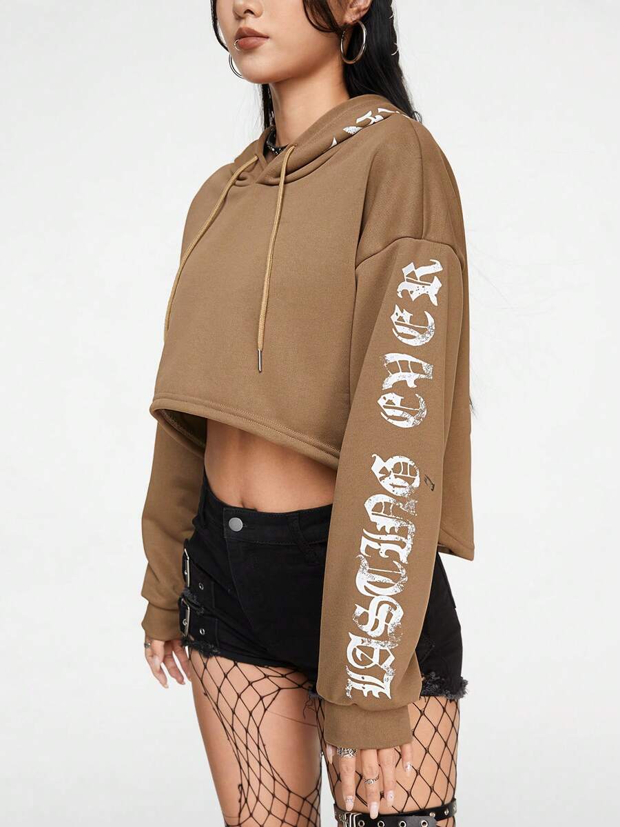 Grunge Punk Casual Letter Print Cropped Loose Sweatshirt For Women, Khaki, Autumn/Winter