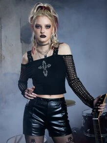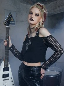 Grunge Punk Cross Graphic Cold Shoulder Grommet Eyelet Top