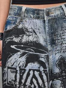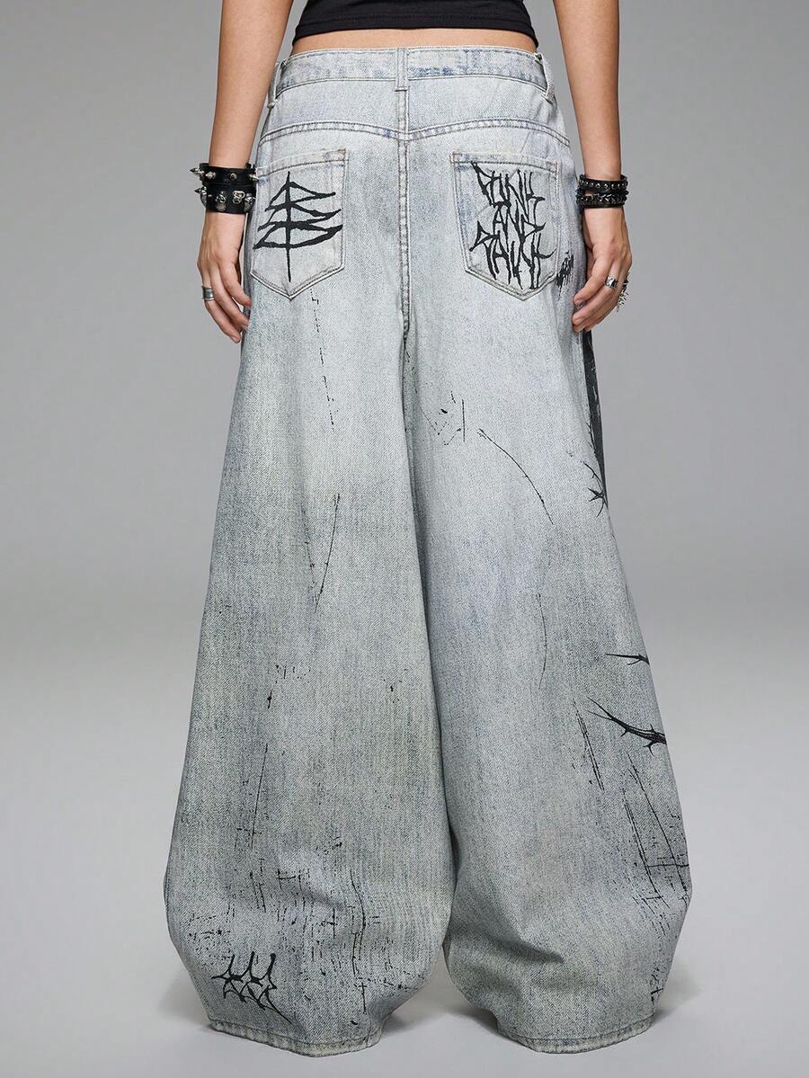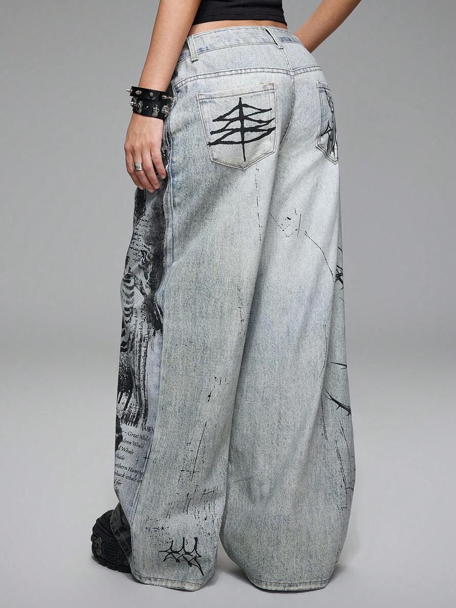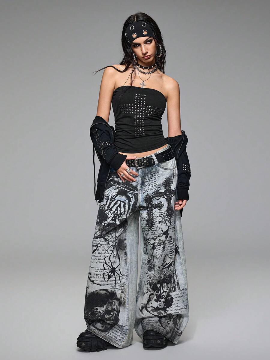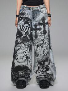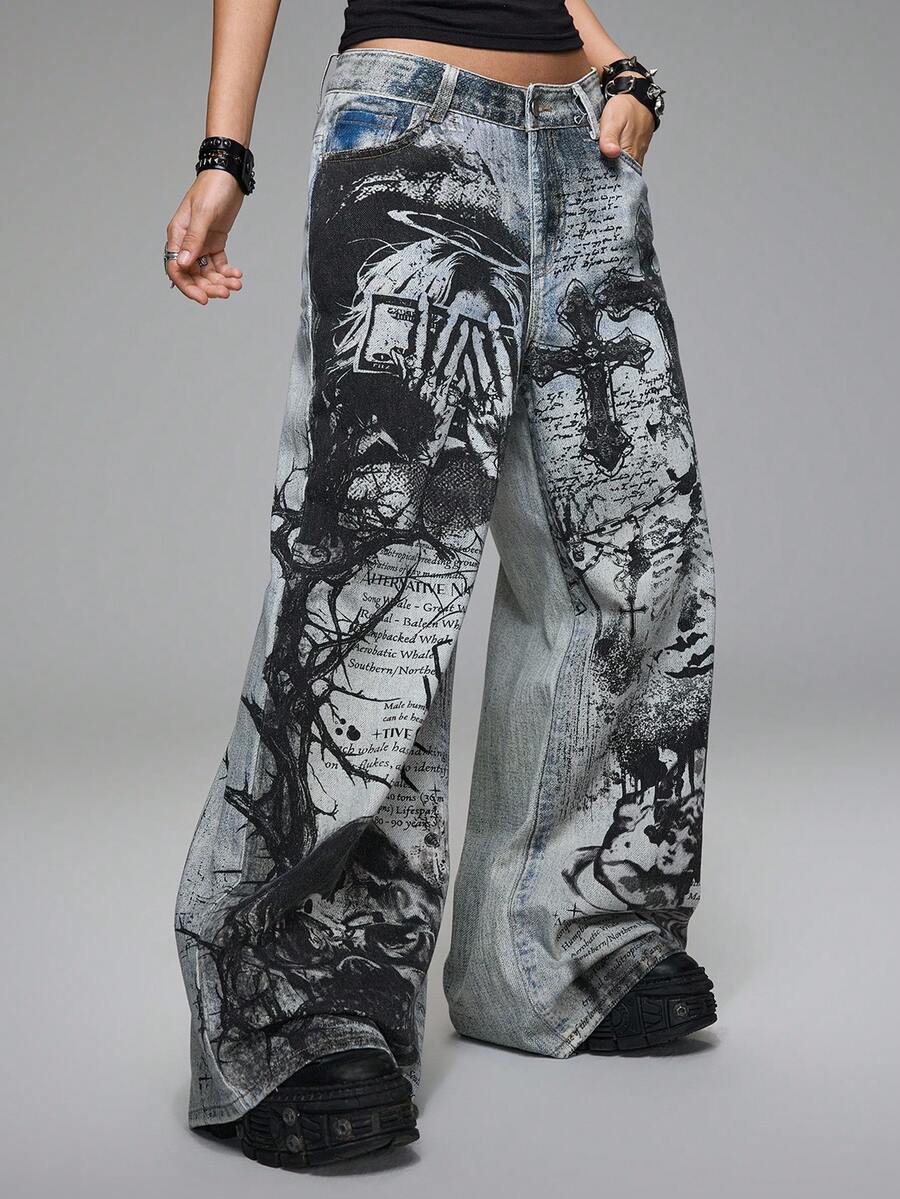 Grunge Punk Dark Punk Cross Skull Angel Spider Slogan All-Over Print Women Wide Leg Jeans