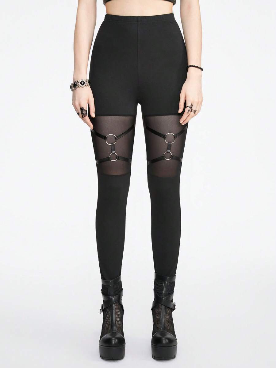 Grunge Punk Dark Punk Hollow Out See-Through Metal Buckle Decoration Tight-Fitting Women Leggings, School