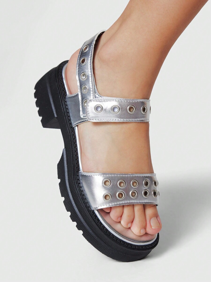 Grunge Punk Dark Silver Punk Gothic Rock Strap Breathable Rivet Sandals, Gothic Summer Open Toe Roman Beach Sandals With Soft Sole For Women, Wedge Platform Thick Sole Sandals Spring Shoes Spring Break Easter