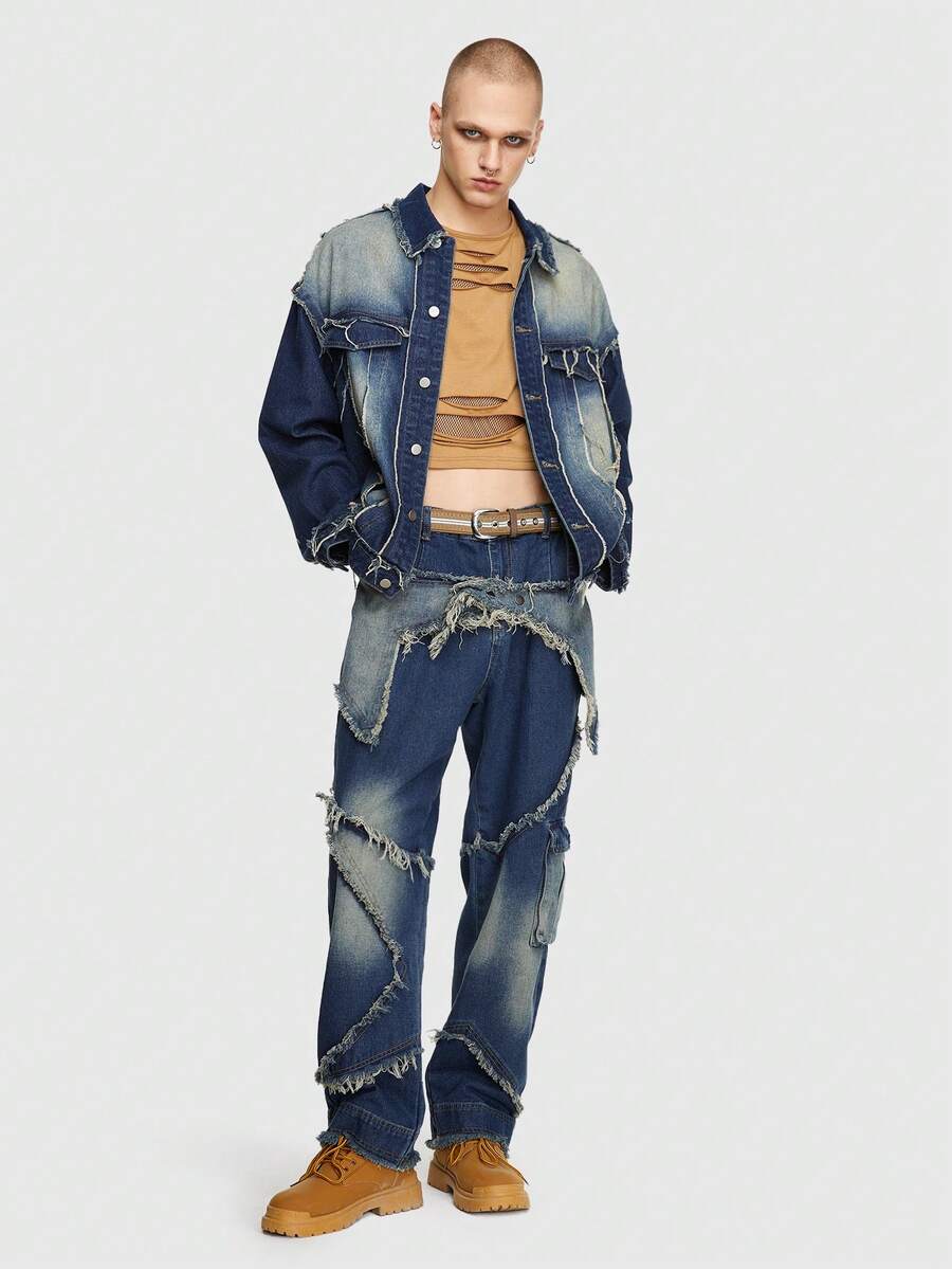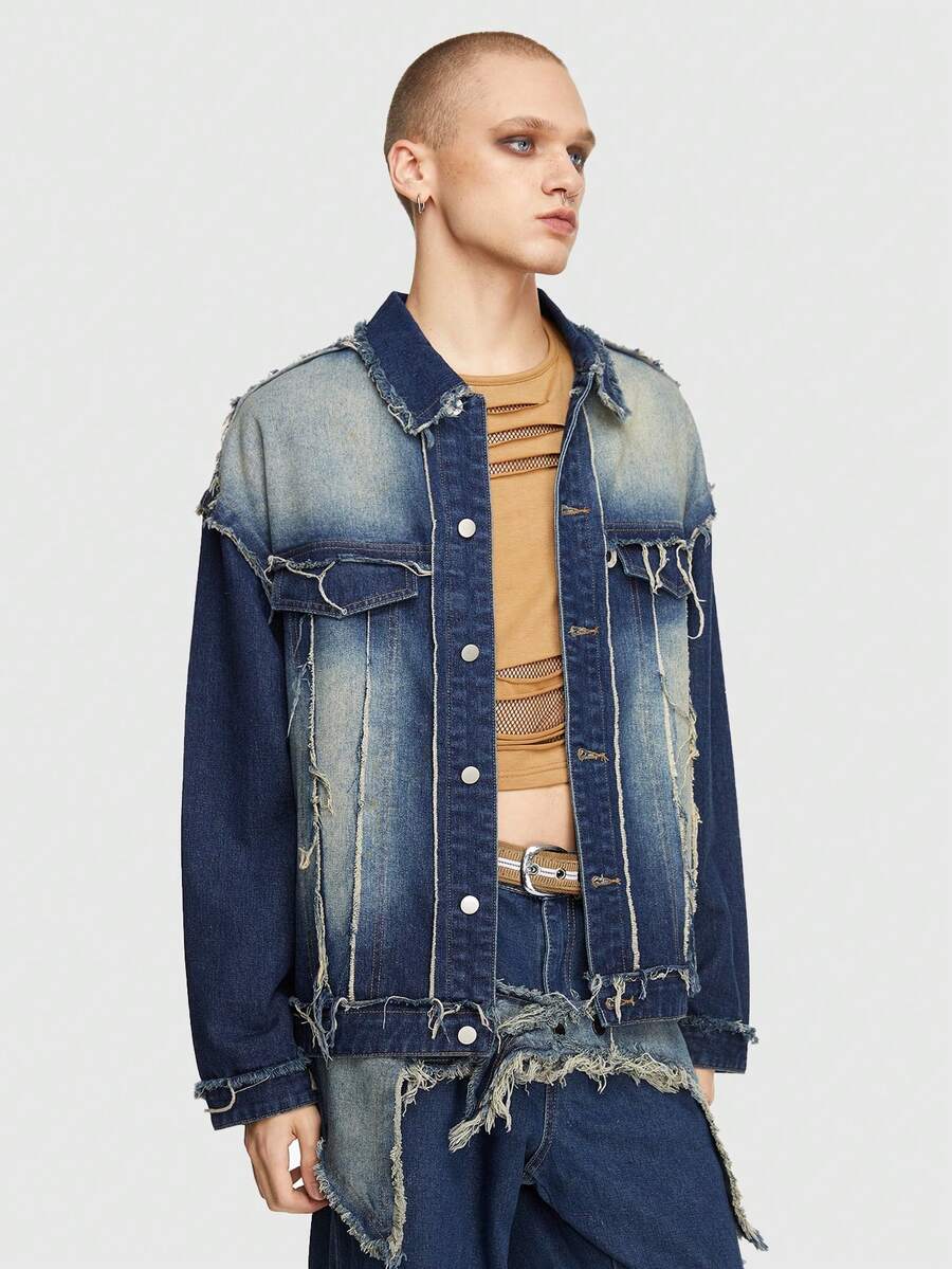 Grunge Punk Guys Bleach Wash Raw Trim Drop Shoulder Denim Jacket