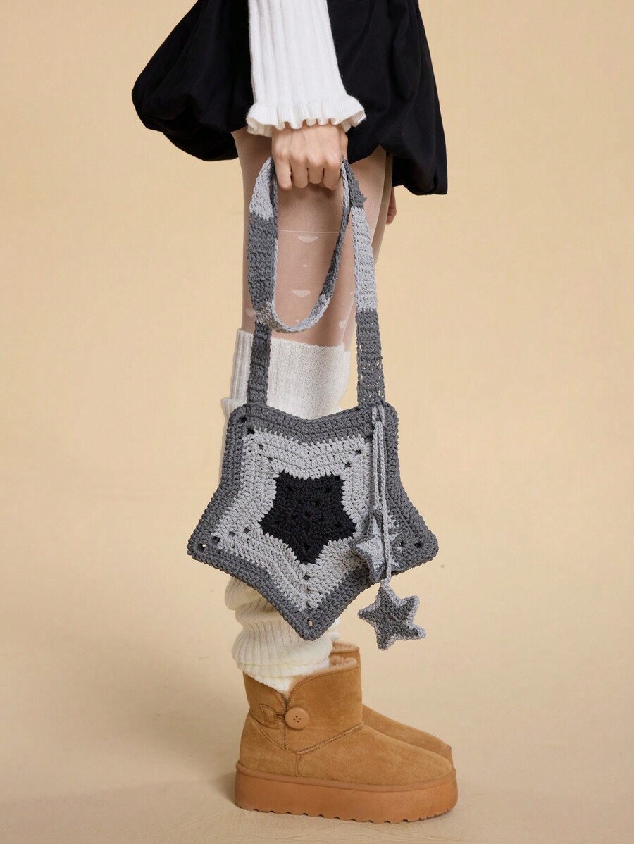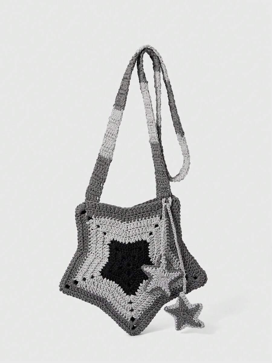 Grunge Punk Handmade Star-Shaped Grey & Black Crochet Crossbody Bag With Charm Decor