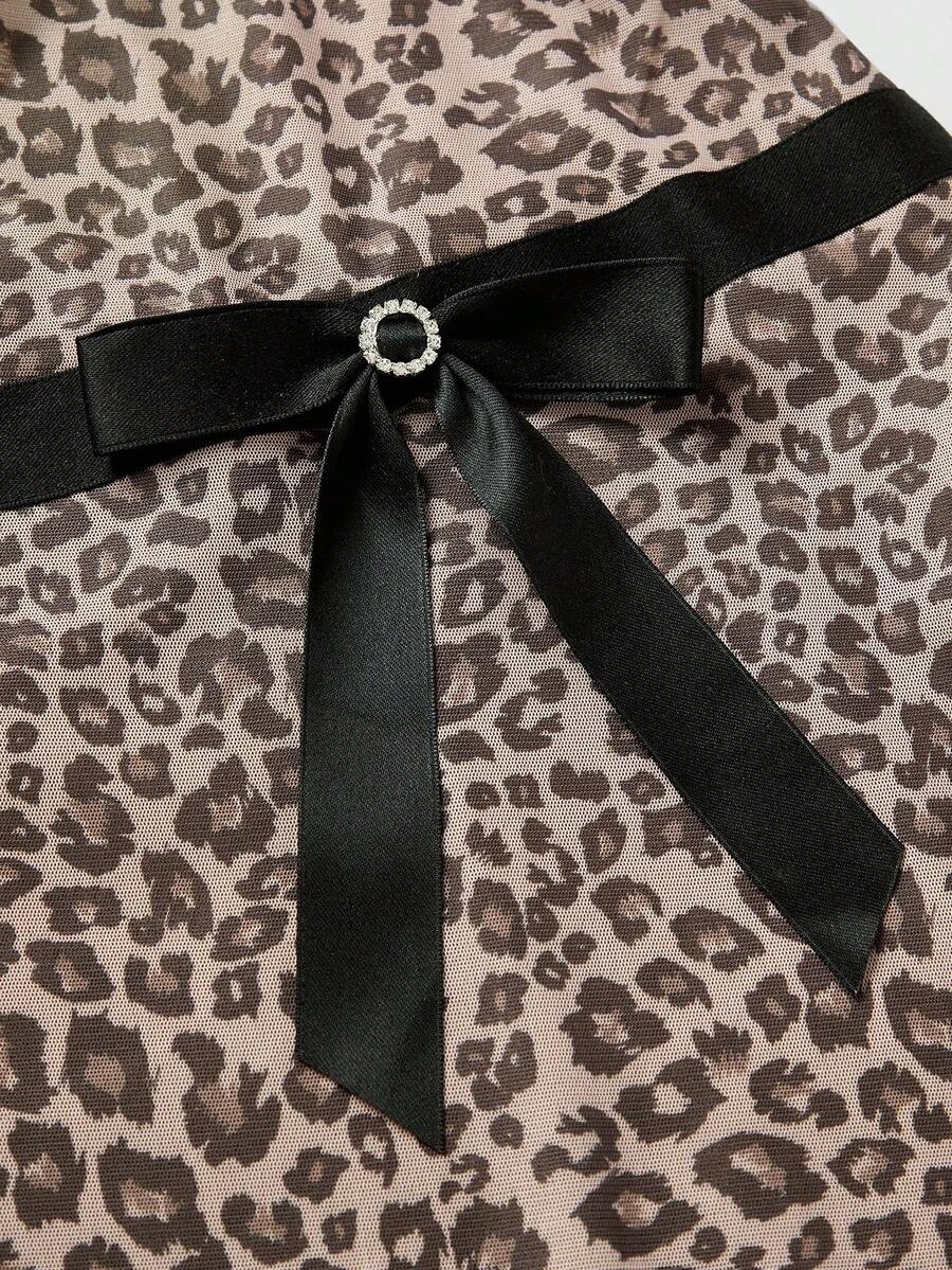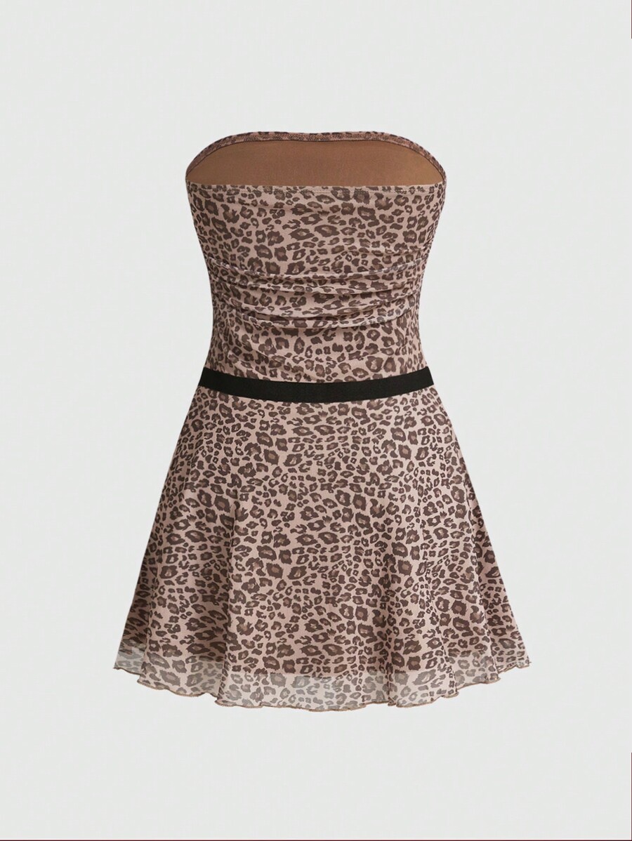 Grunge Punk Ladies Leopard Print Mesh Ruched Bow Knot Strapless Dress