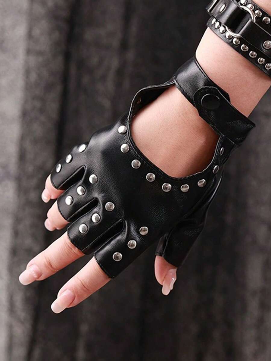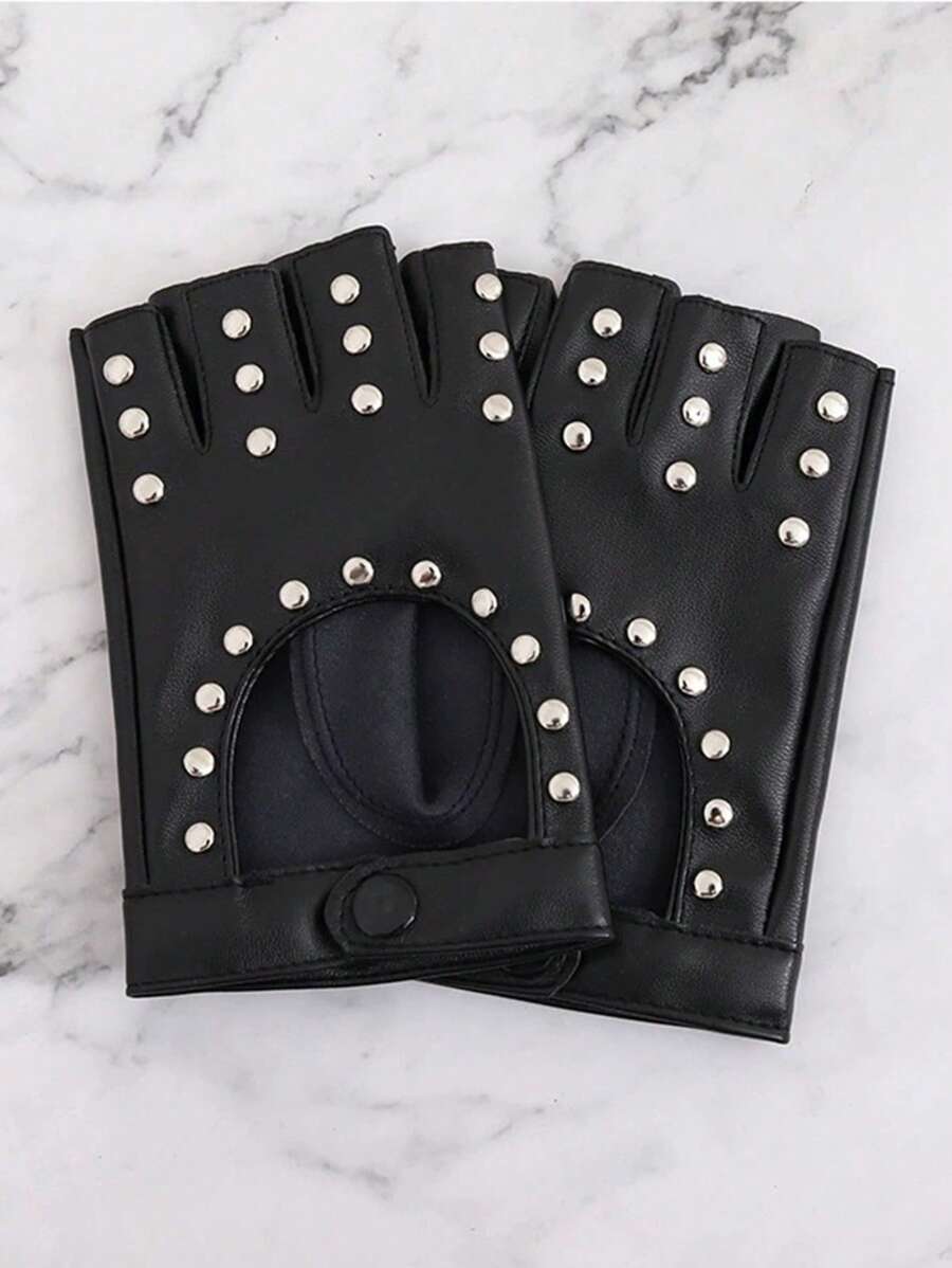 Grunge Punk Ladies PU Leather Rivet Black Y2K Five Fingers Gloves