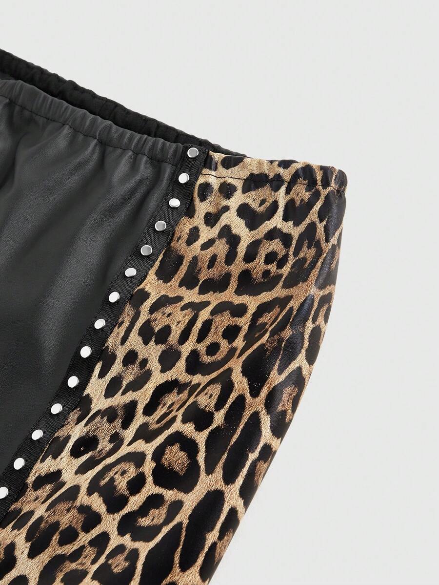 Grunge Punk Leopard Print Patchwork Punk Studded Super Low Waist Stretchy PU Skirt For Women