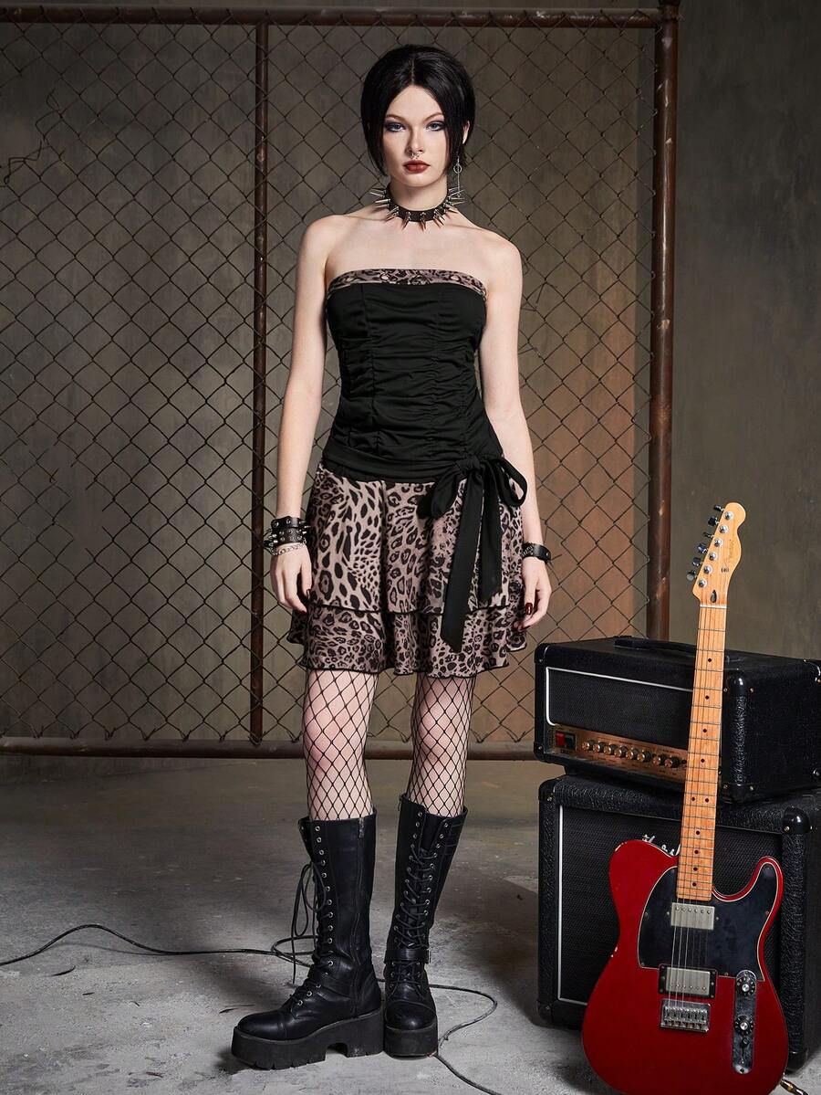 Grunge Punk Leopard Print Ruched Knot Front Tube Dress