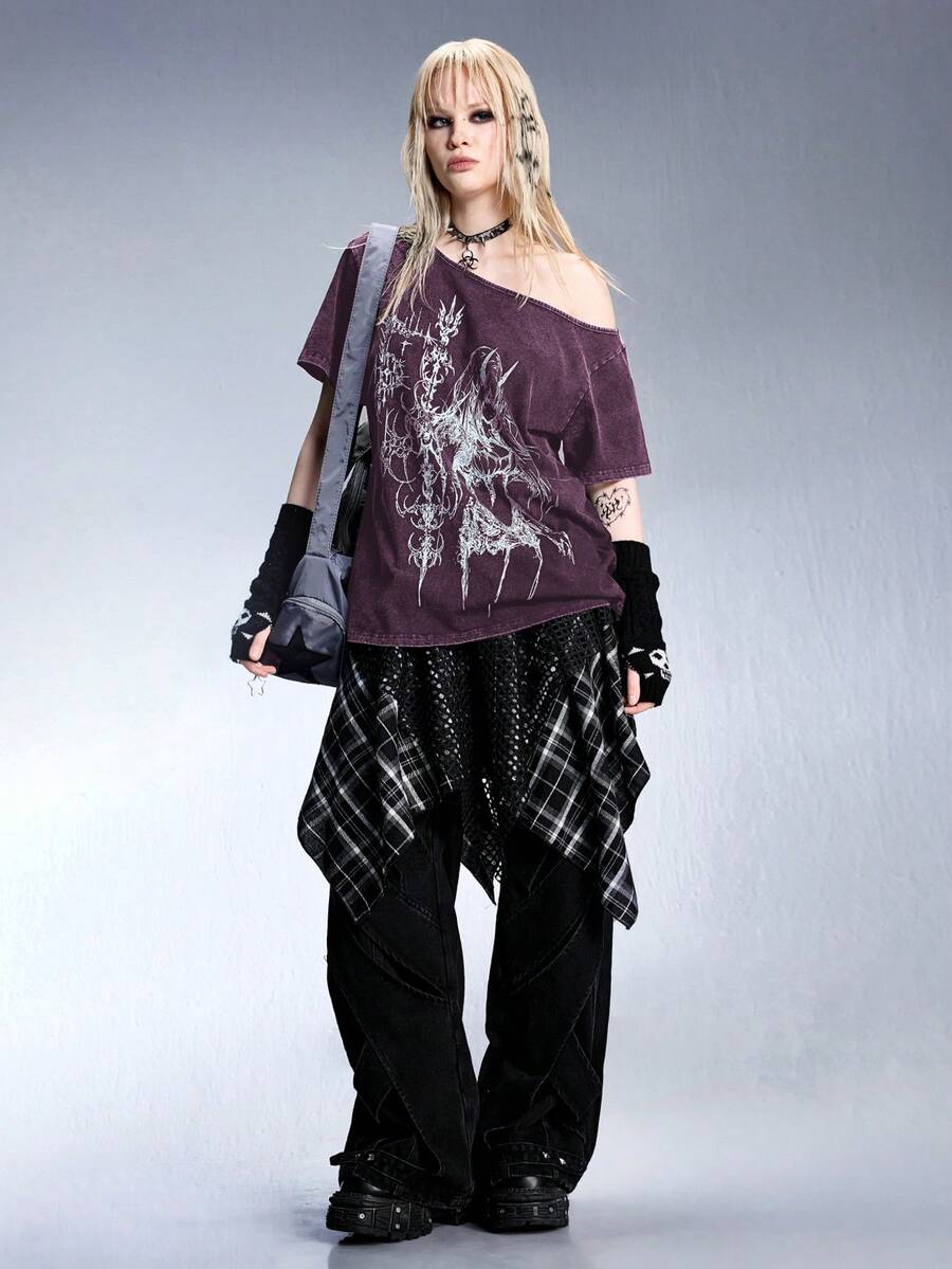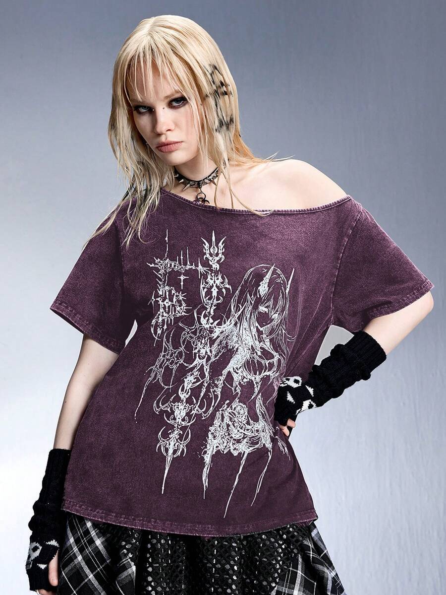 Grunge Punk Loose Fit Punk Graphic Print Distressed Oversized Oblique Shoulder Short Sleeve T-Shirt For Women, Purple