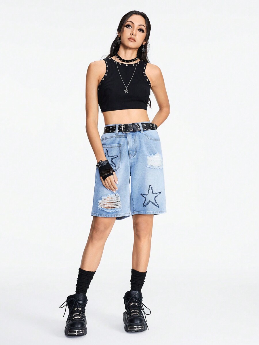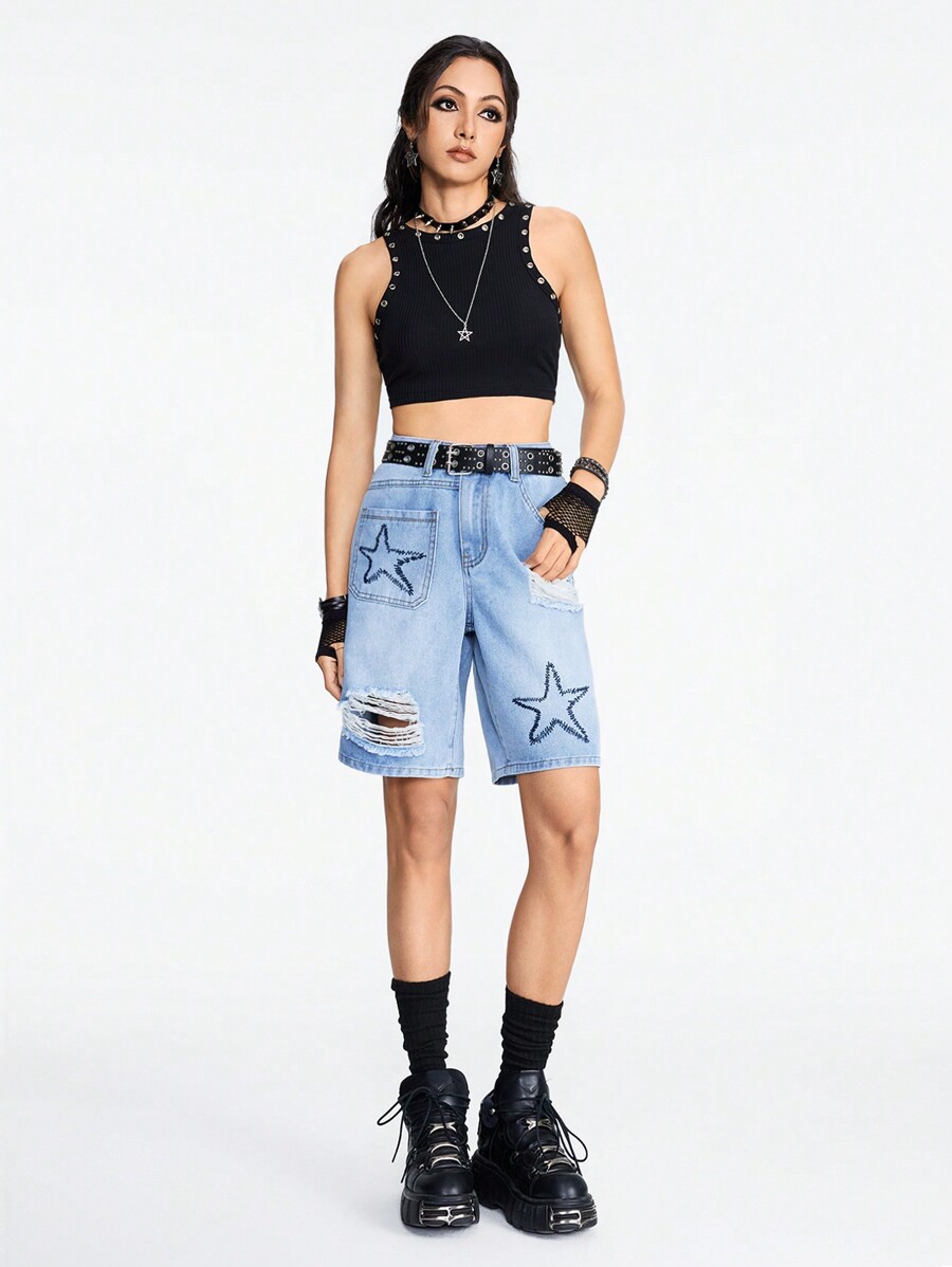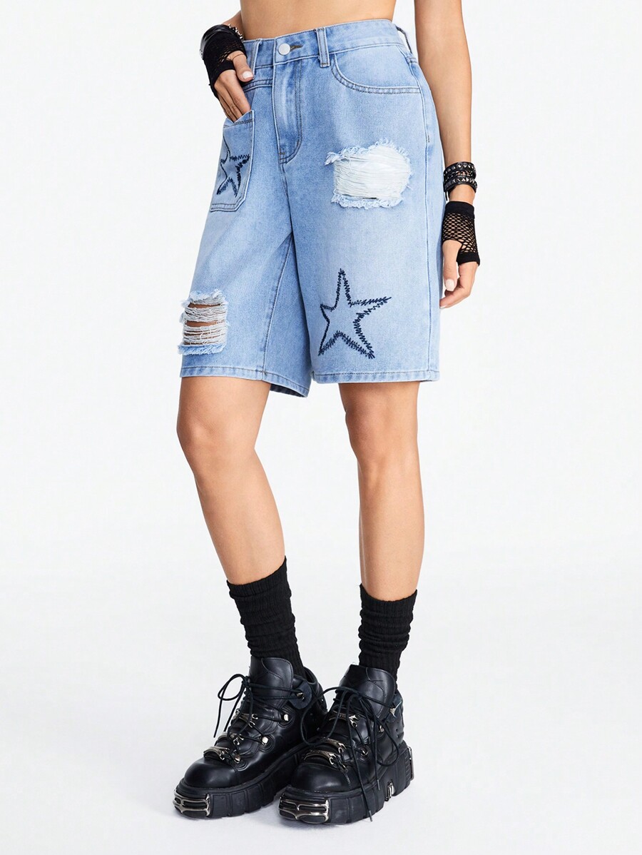 Grunge Punk Loose Straight Mid-Rise Denim Shorts For Women With Star Embroidery, Graffiti, Ripped Design And Multiple Pockets