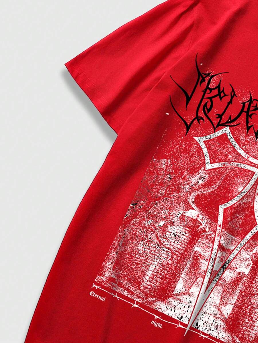 Grunge Punk Men Red Cross Pattern Casual Short Sleeve T-Shirt
