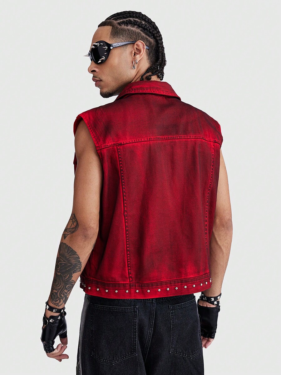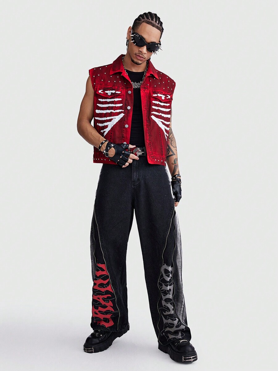 Grunge Punk Men Skeleton Print Studded Denim Vest Jacket For Summer