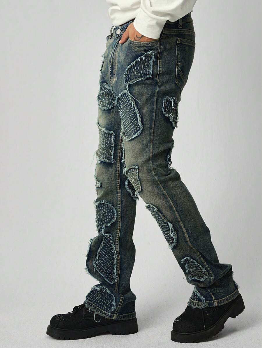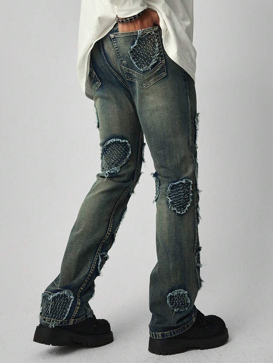 Street Life Men's Embroidered Frayed Edge Layered Flared Jeans