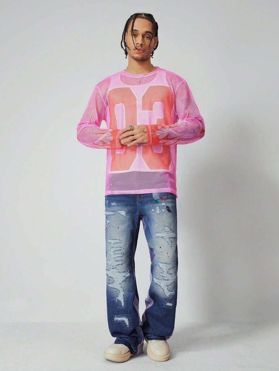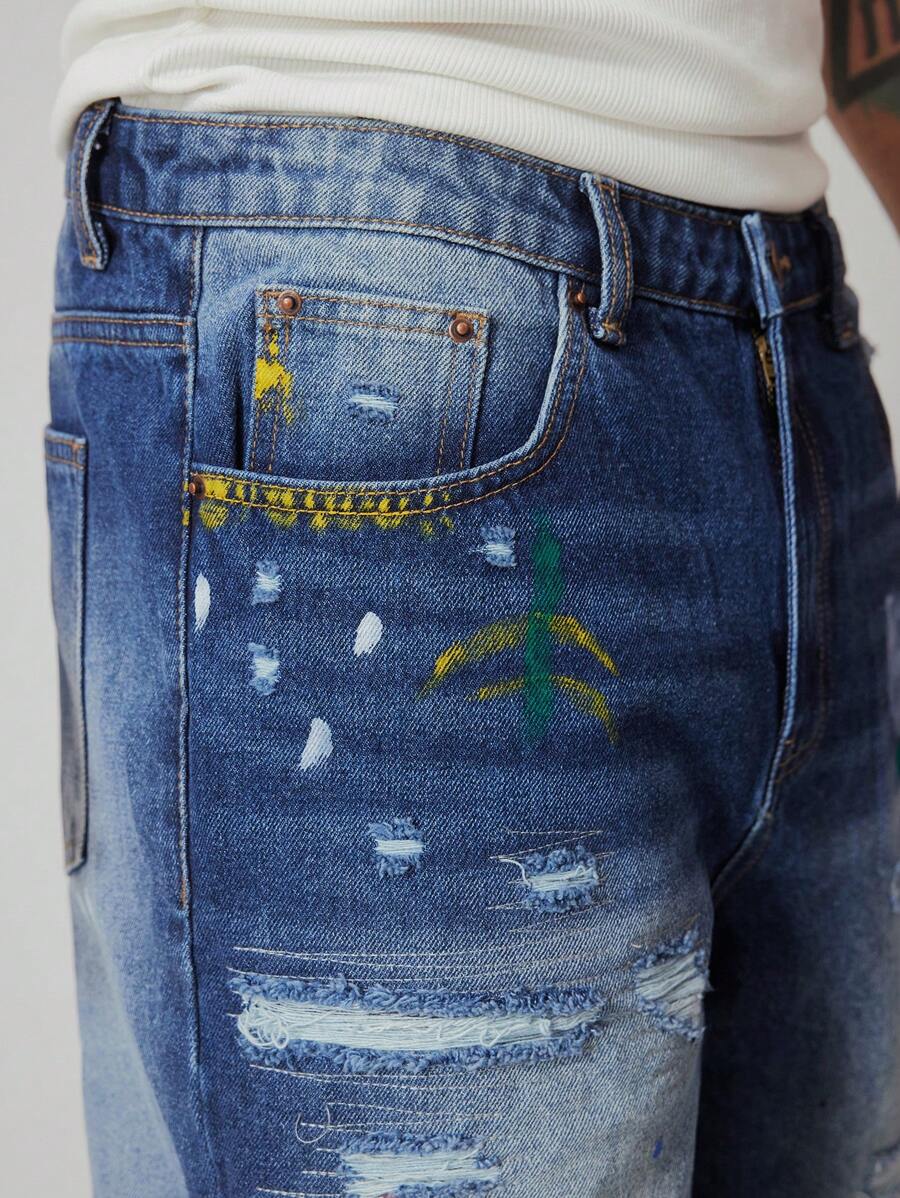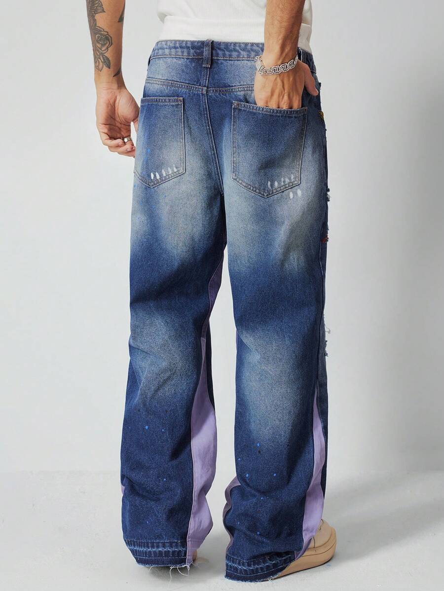 Grunge Punk Men's Grunge Washed Tie-Dye Print Pocket Distressed Straight Leg Casual Jeans