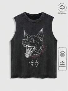 Grunge Punk Men's Summer Casual Dog Printed Round Neck Tank Top With Distressed Details, School, 2000s Style