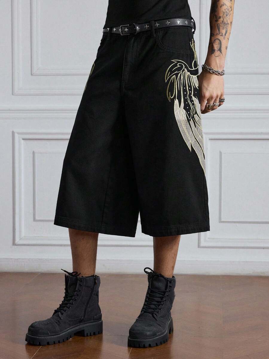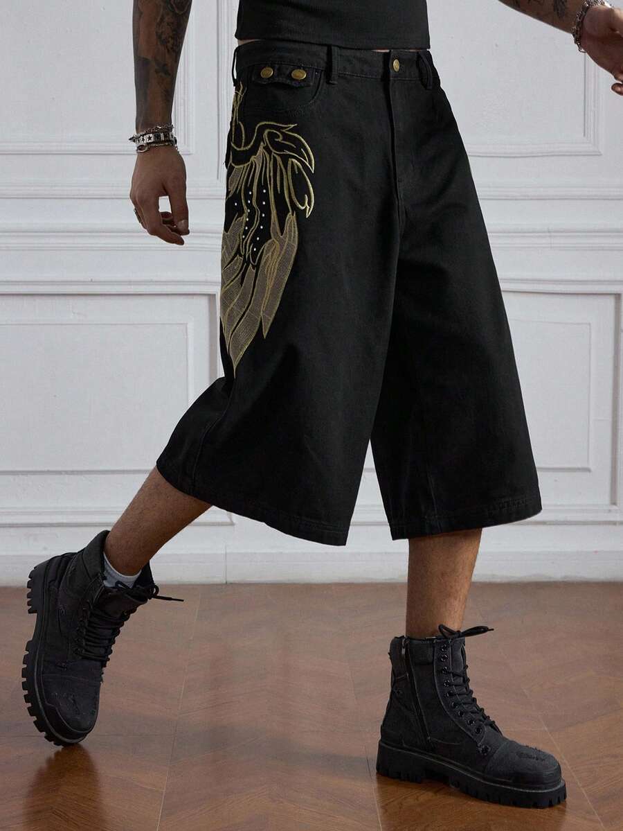 Grunge Punk Men's Summer Street Embroidered Loose Wide Leg Denim Shorts