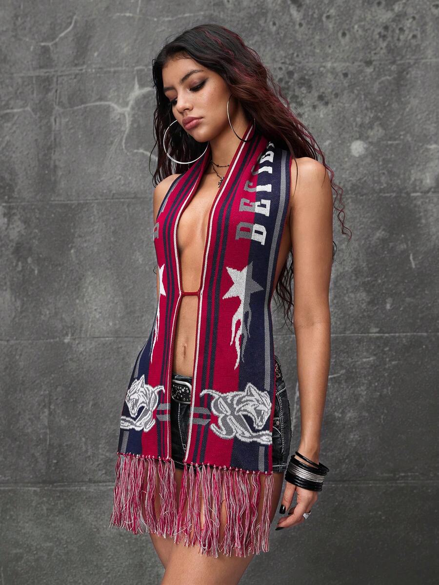 Grunge Punk Music Festival : Fringe Scarf Design, Sporty, Backless, Sexy Women Knit Top