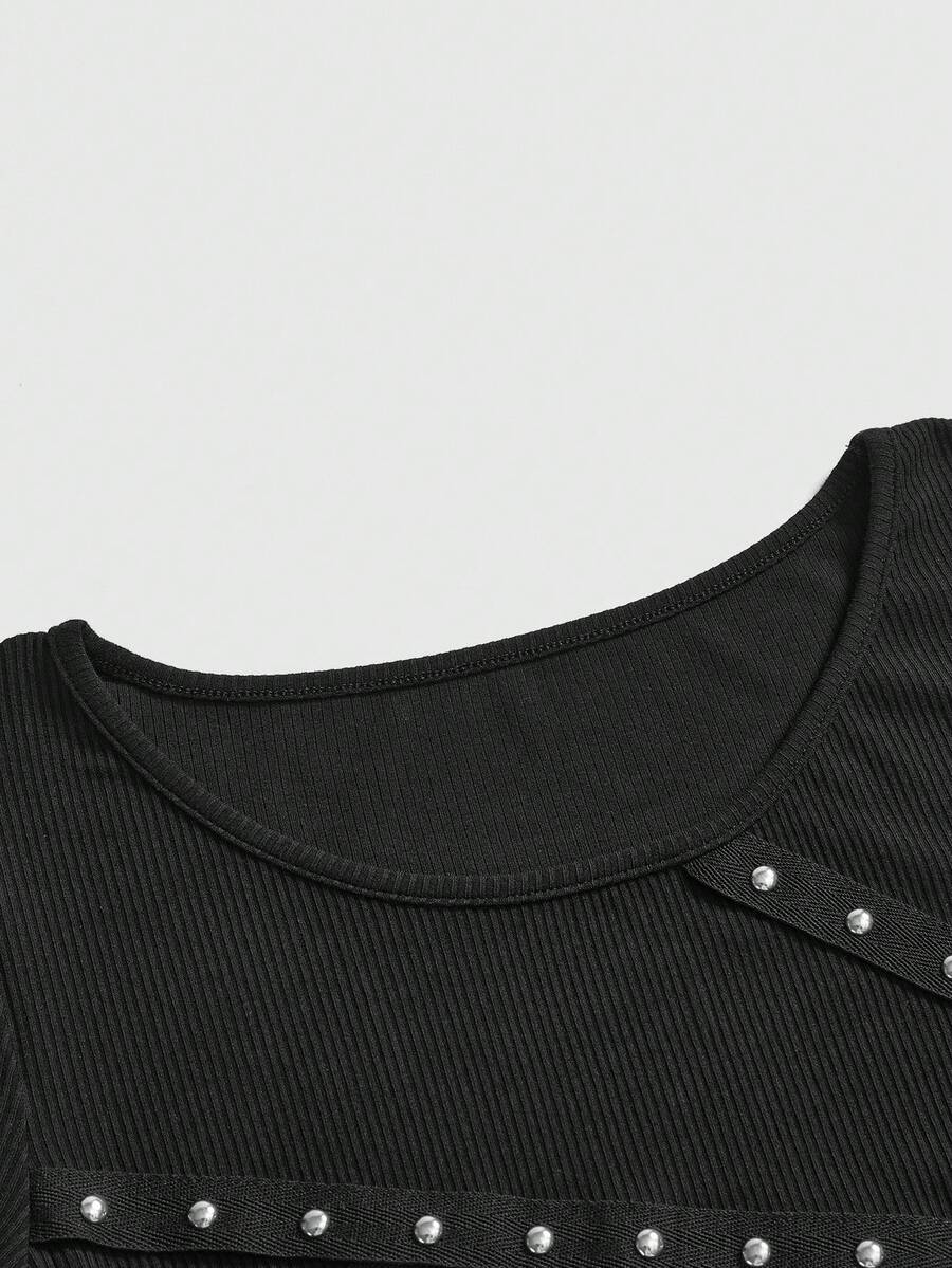 Grunge Punk Music Festival Rock Rivet Studded Rhinestones Tube Top V-Neck Sexy Black T-Shirt For Women