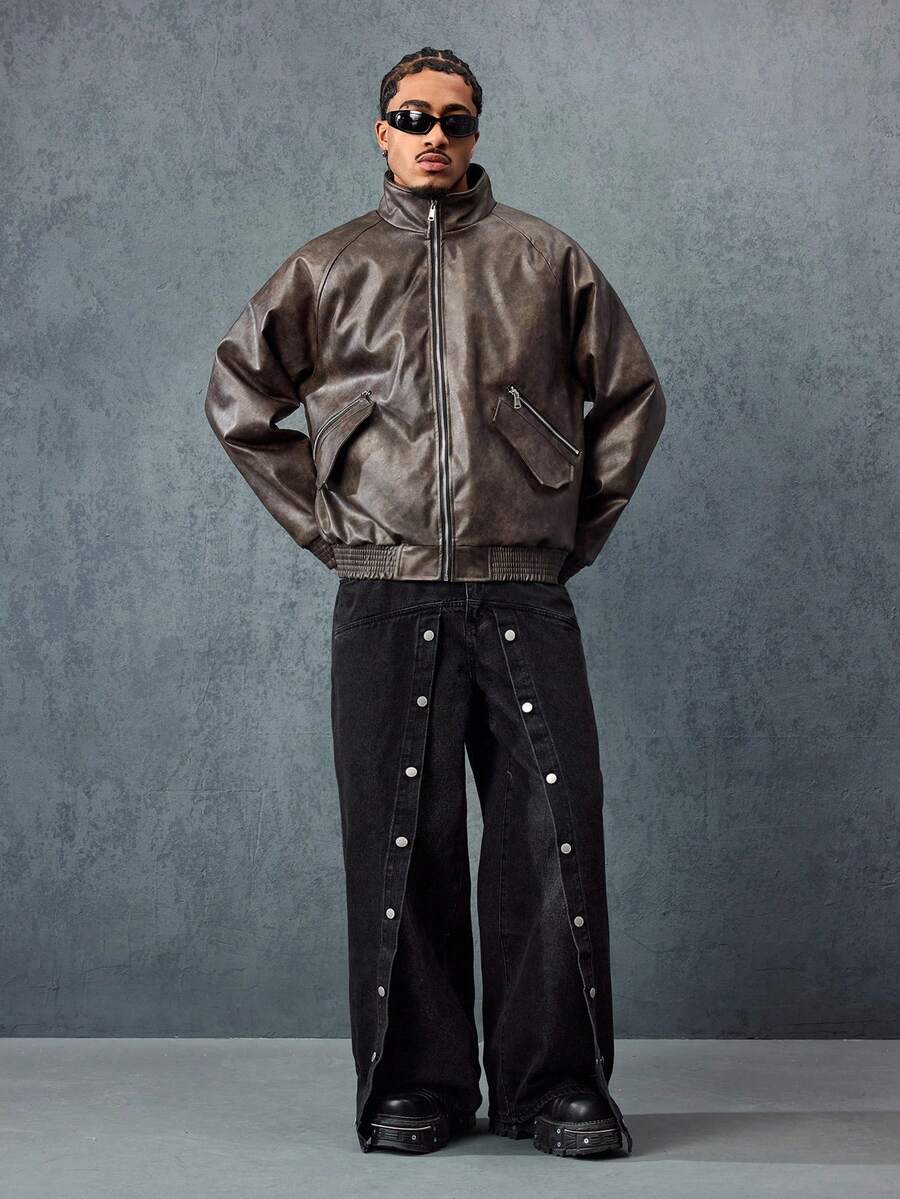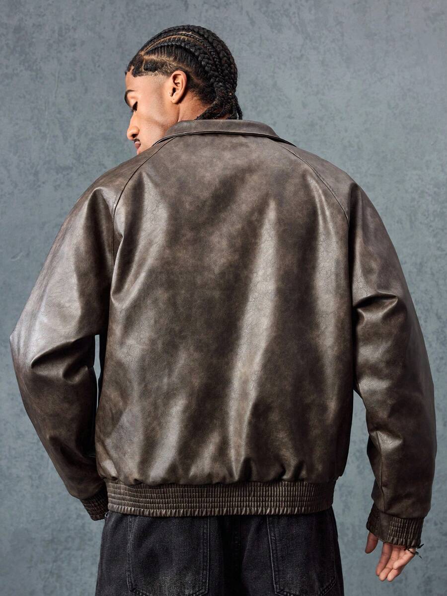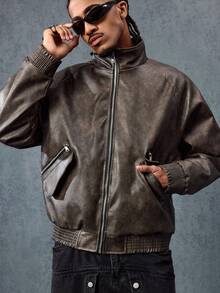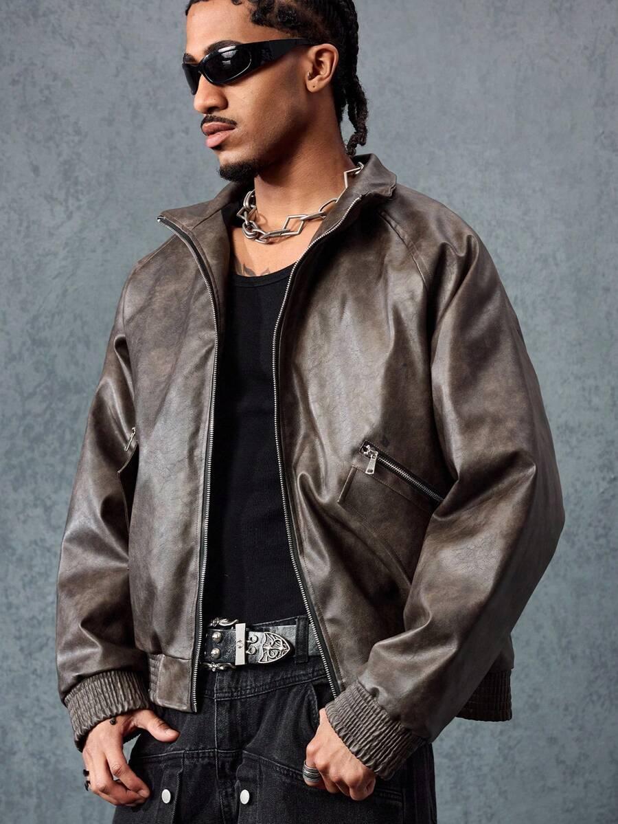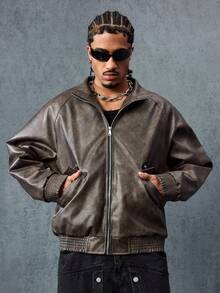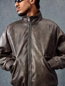 Grunge Punk Plain Stand Collar Raglan Sleeve Casual Zip-Up Stand Collar Faux Leather Jacket