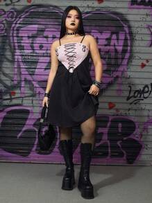Grunge Punk Plus Size Color-Block Cami Dress With Metal Cowl Neck Detail, Black & Pink