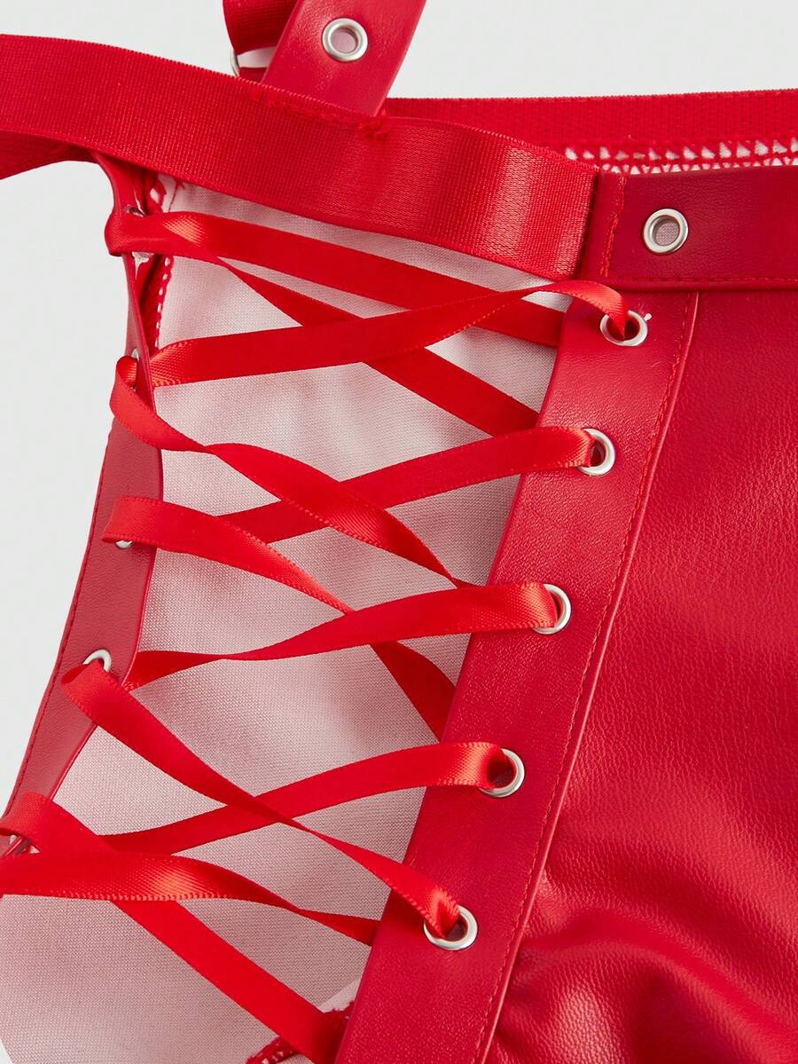 Grunge Punk Plus Size Dark Goth Punk Hollow Lace-Up Metal Leather Fishnet Lingerie Body Suit
