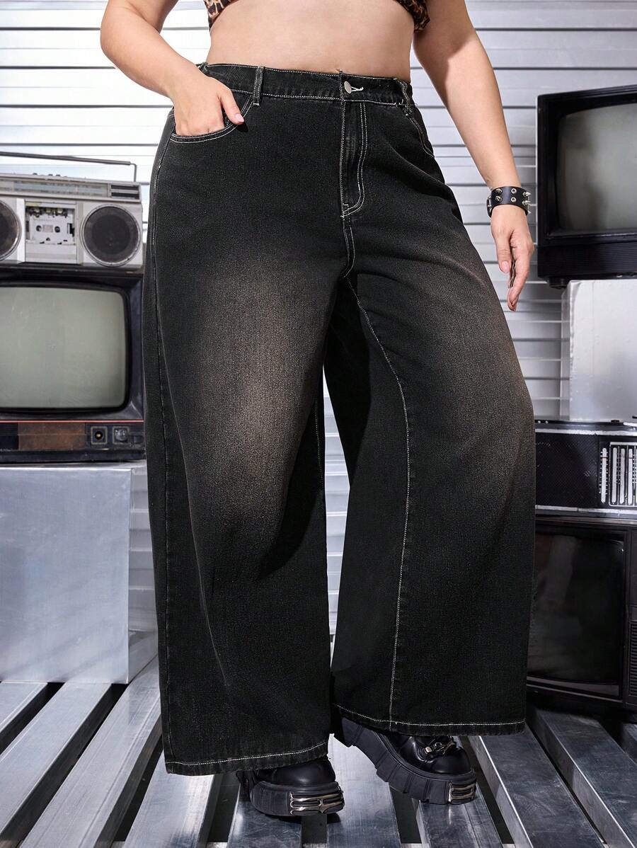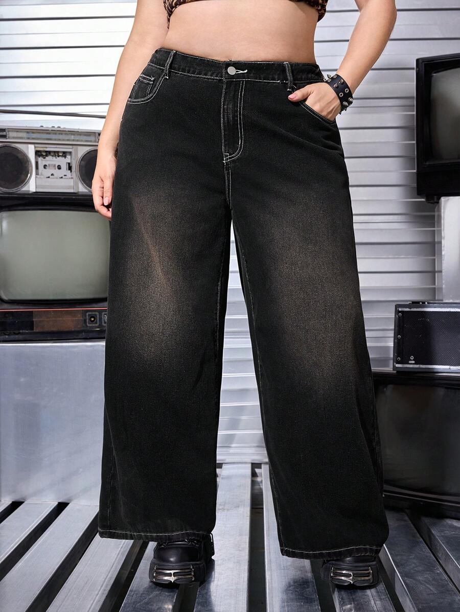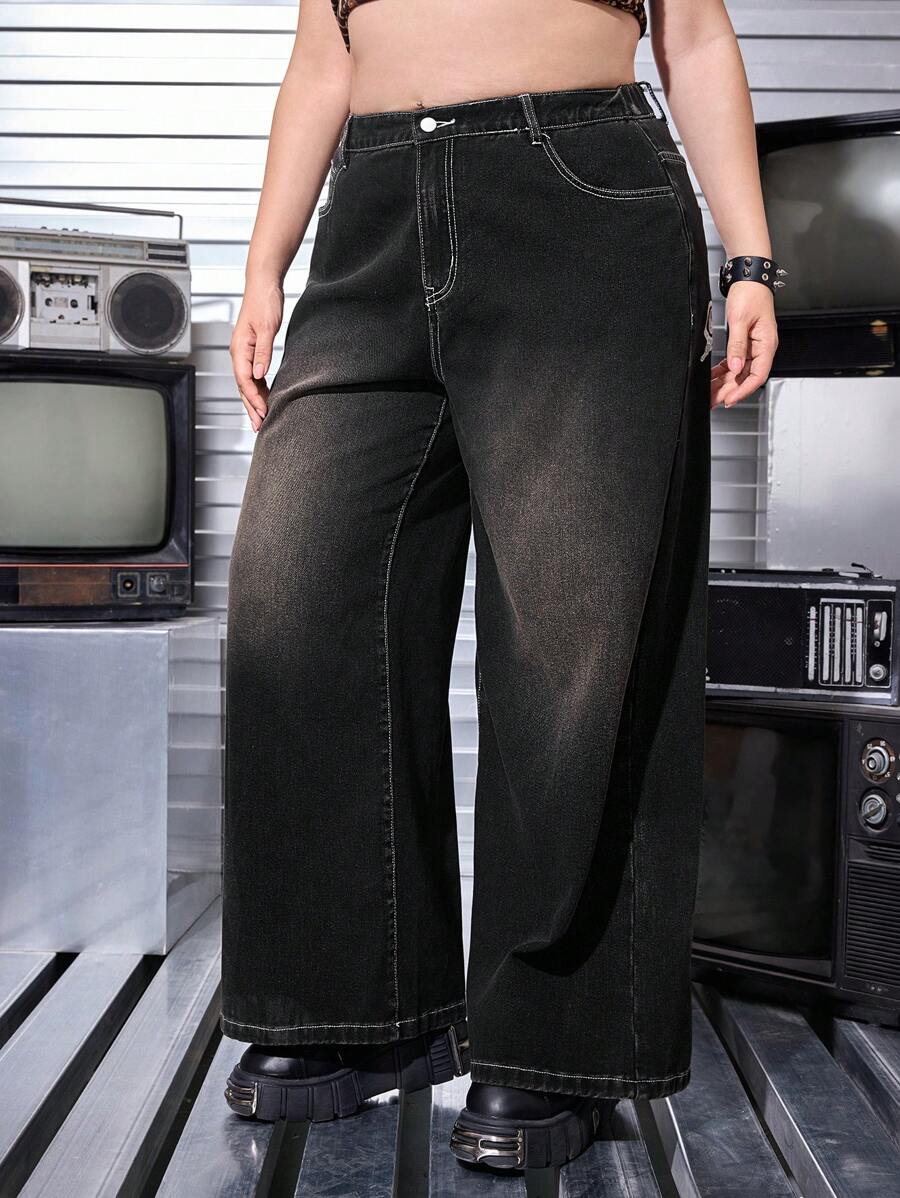 Grunge Punk Plus Size Punk Distressed Cross & Vine Washed Extra Loose Straight Leg Super Long Jeans