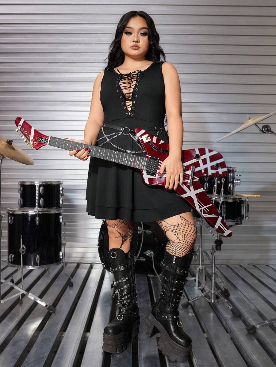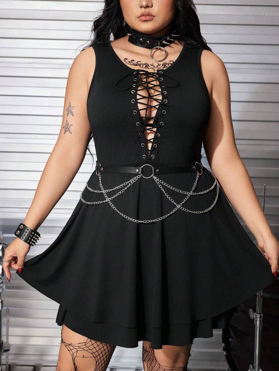 Grunge Punk Plus Size Punk O-Ring Drawstring Waist Metal Chain Decor A-Line Sexy Dress For Summer