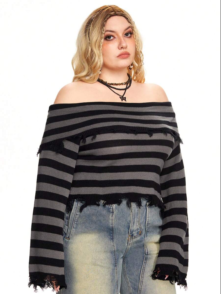 Grunge Punk Plus Size Women's Punk Style Off-Shoulder Striped Flare Sleeve Distressed Form-Fitting Sweater