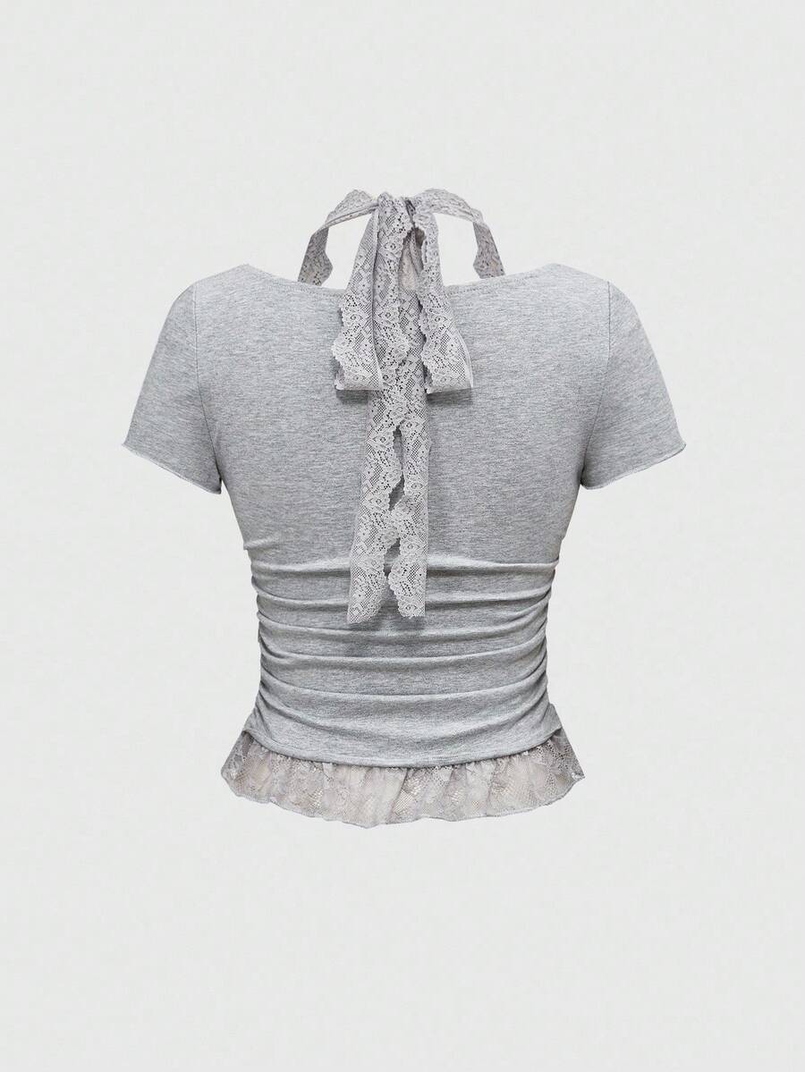 Grunge Punk Punk Bro Letter Rhinestone & Lace Patchwork Crew Neck Fitted Women T-Shirt
