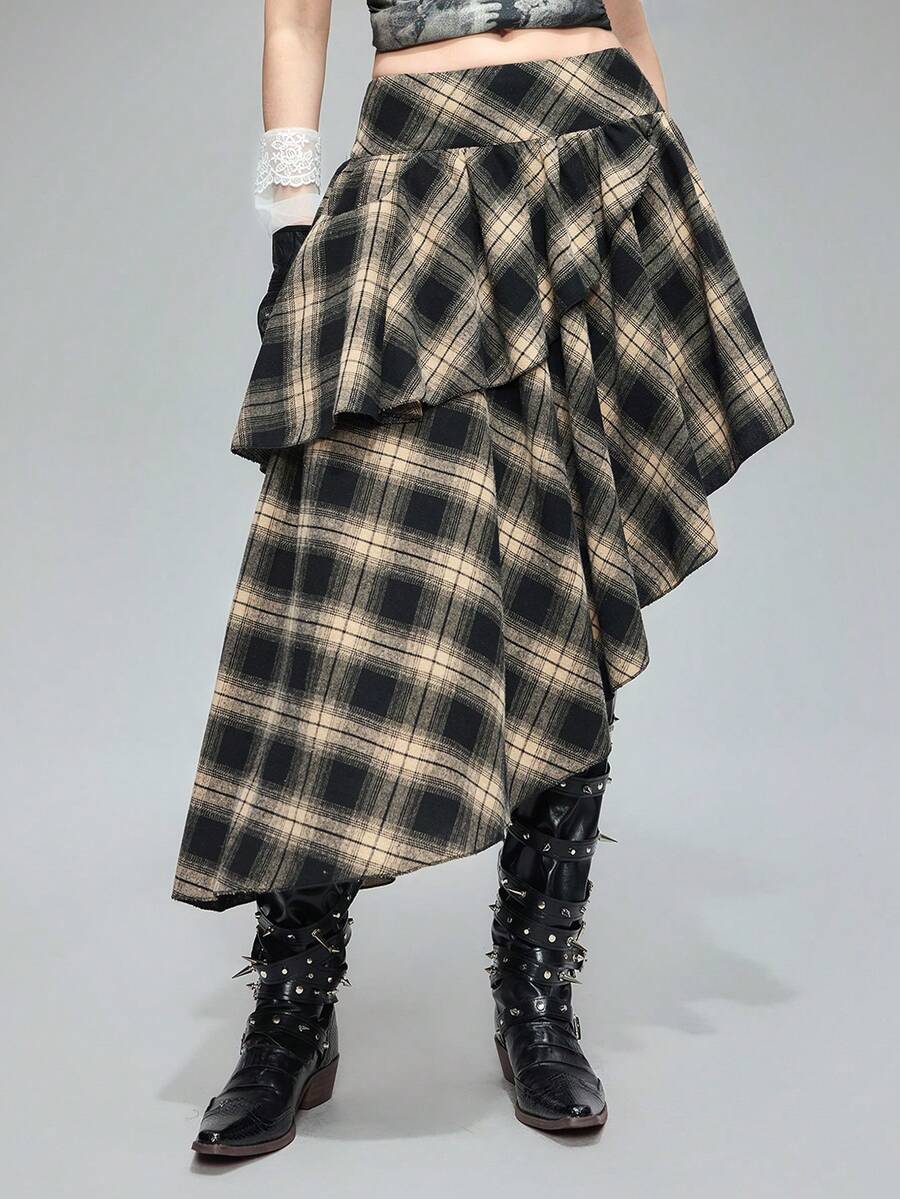 Grunge Punk Punk Retro Millennium Y2K Plaid Patchwork Asymmetric Hem Pleated Loose A-Line Skirt For Women