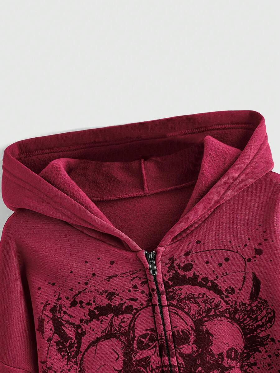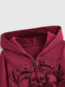 Grunge Punk Rose & Skull Print Zip-Up Hoodie With Splatter Design