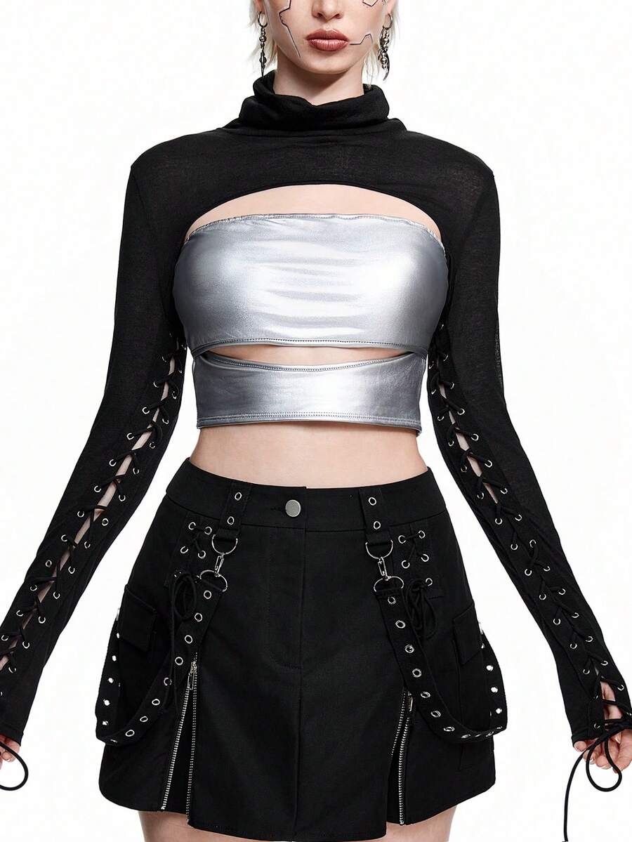 Grunge Punk Sexy Hollow-Out Front Corset Lace-Up Top With See-Through Sleeves