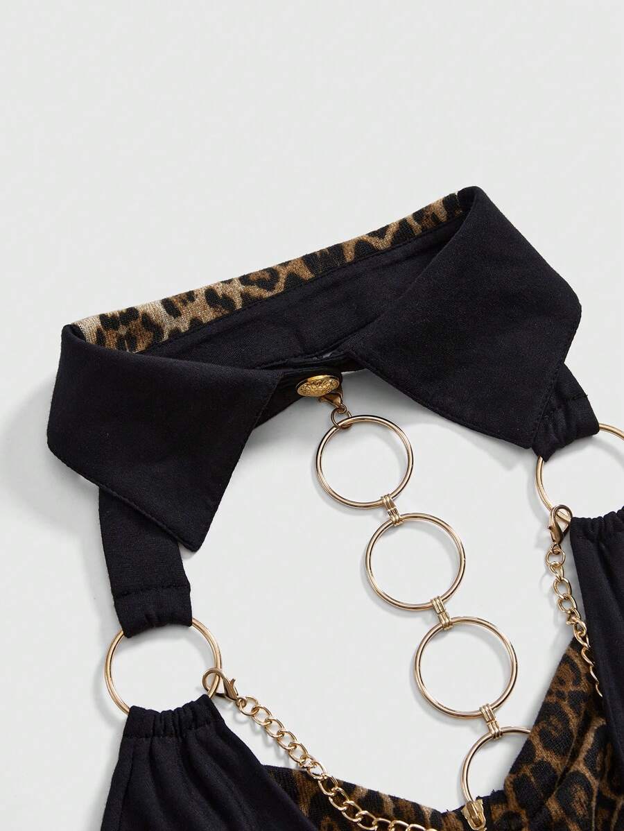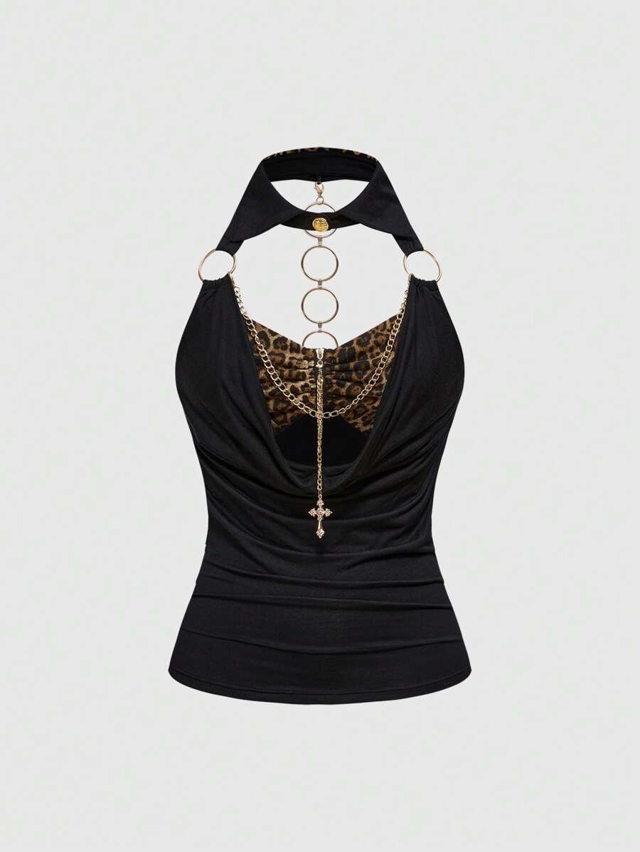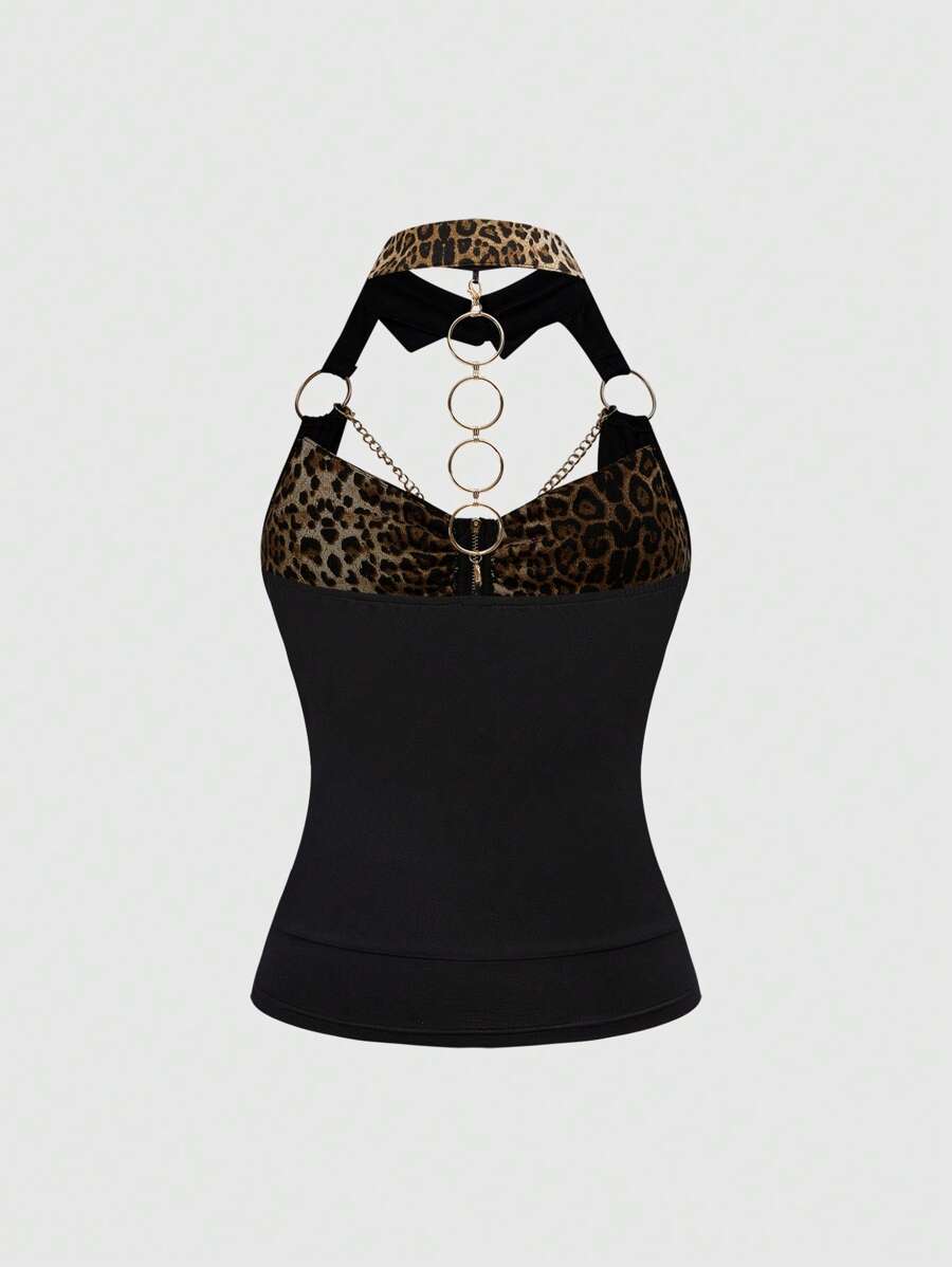 Grunge Punk Shibuya Gal Leopard Print Patchwork Golden Cross Plunge Neck Backless Bodycon Tank Top For Women