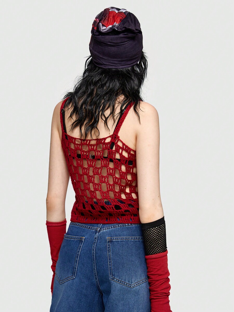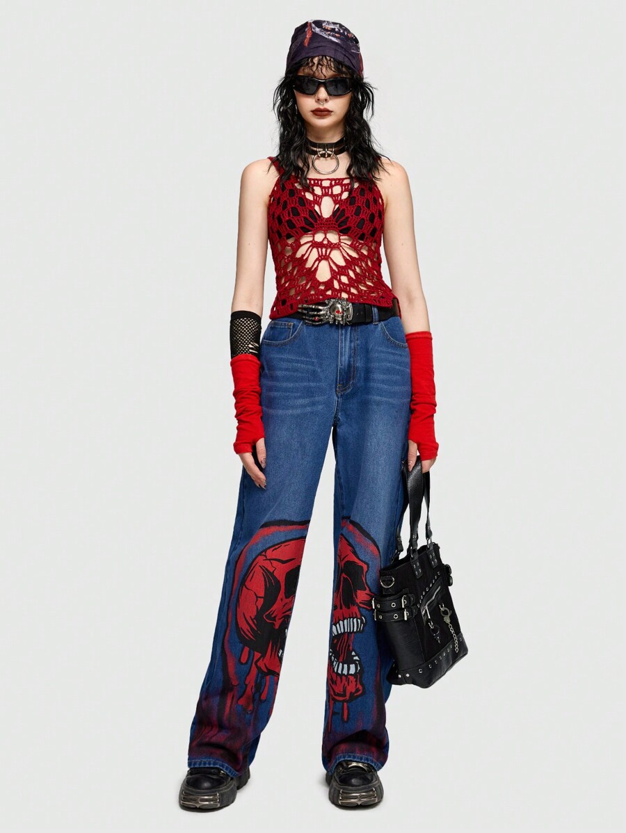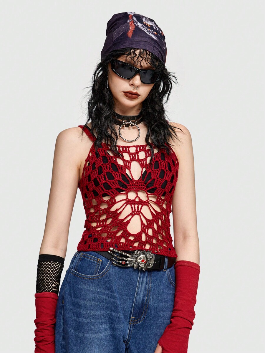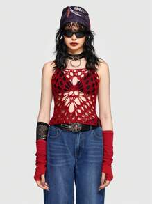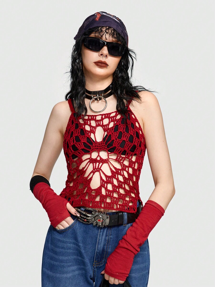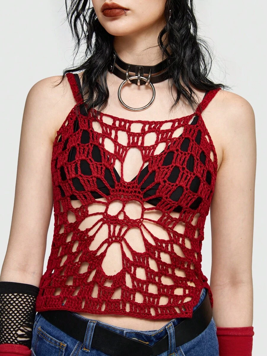 Grunge Punk Skull Pattern Hollow Out Cami Knit Top