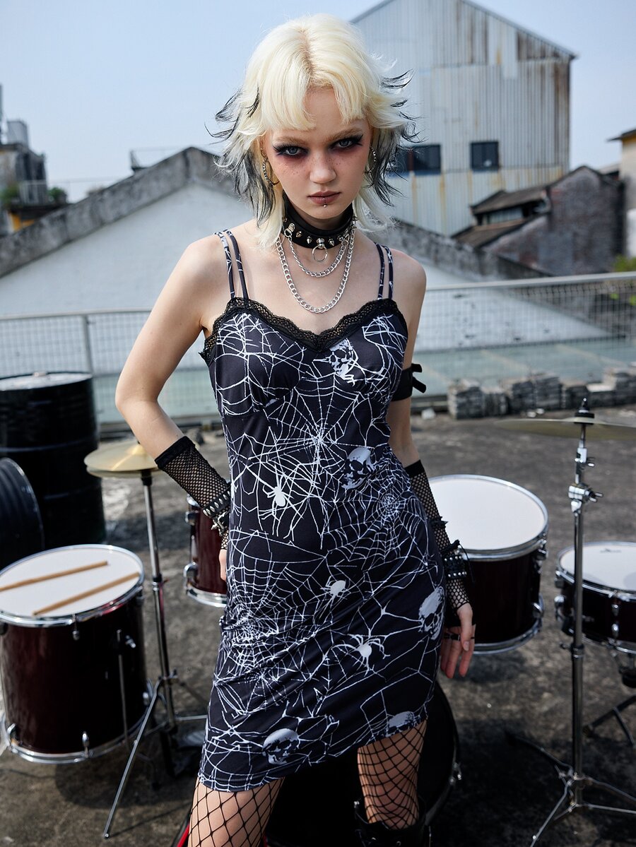 Grunge Punk Spider Web Print Contrast Lace Cami Dress