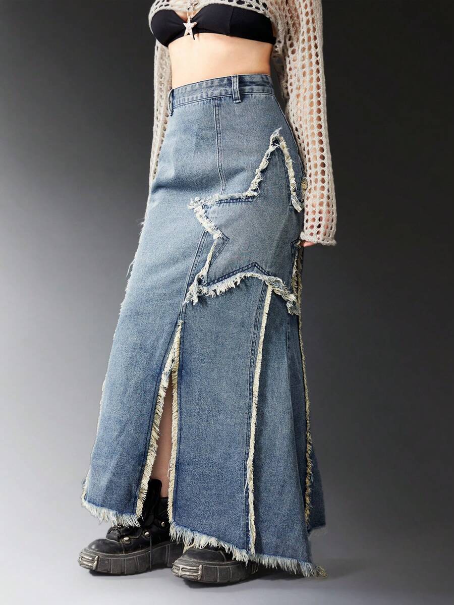 Grunge Punk Star Pattern Raw Trim Split Thigh Denim Skirt
