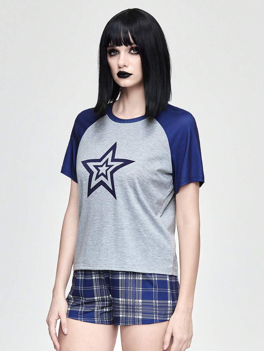 Grunge Punk Star Print Contrast Color Raglan Sleeve Top And Plaid Shorts Pajama Set