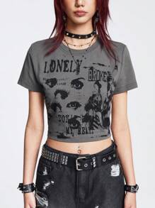 Grunge Punk Streetwear Sexy Painting Face Print Slim Fit Short Sleeve T-Shirt