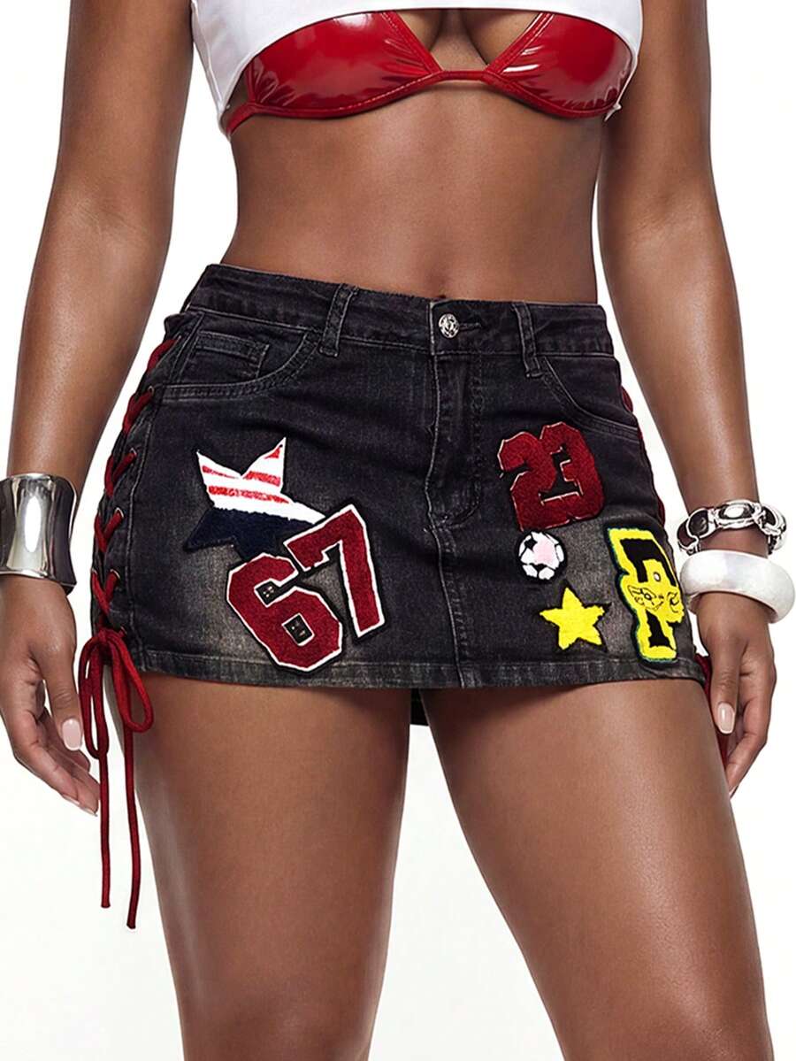 Grunge Punk Streetwear Sports Numeric Flag Embroidered Denim Mini Skirt