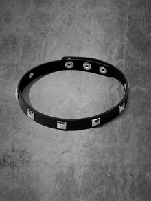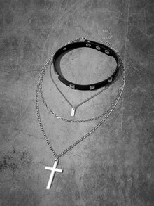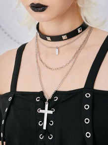 Grunge Punk Studded Decor Choker & Lock & Rectangle Charm Layered Necklace
