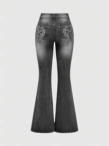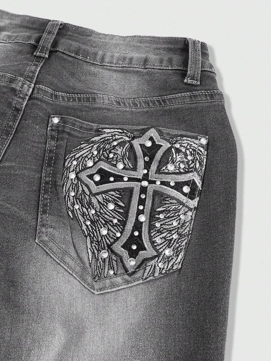 Grunge Punk Subculture Rivet Cross Wings Embroidery Rhinestone Sexy Skinny Flare Pants
