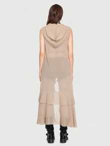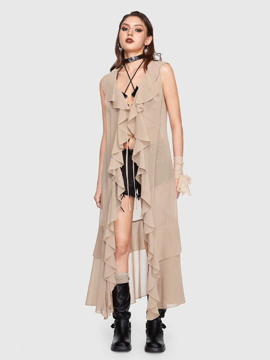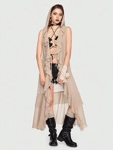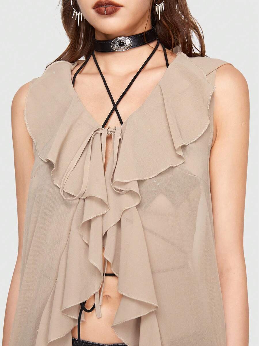 Grunge Punk Tie Front Ruffle Trim Hooded Longline Top