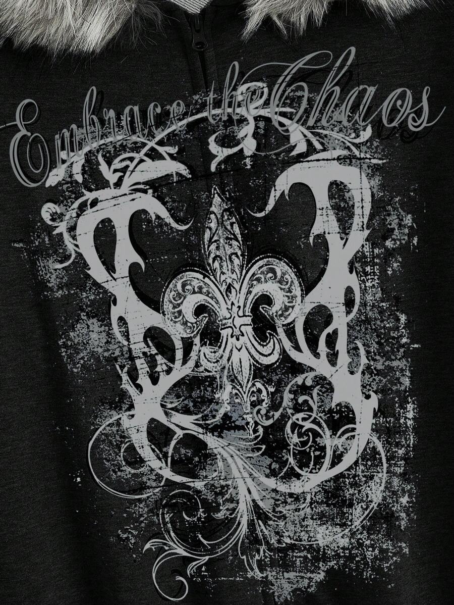 Grunge Punk Vintage Gothic Punk Vines Print Hooded Sweatshirt With Fuzzy Collar, Loose Long Sleeve Women Sweatshirt
