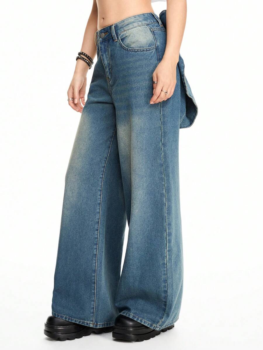 Grunge Punk Vintage Washed Denim Jeans With Big Bow Design, Sweet Streetwear For Women