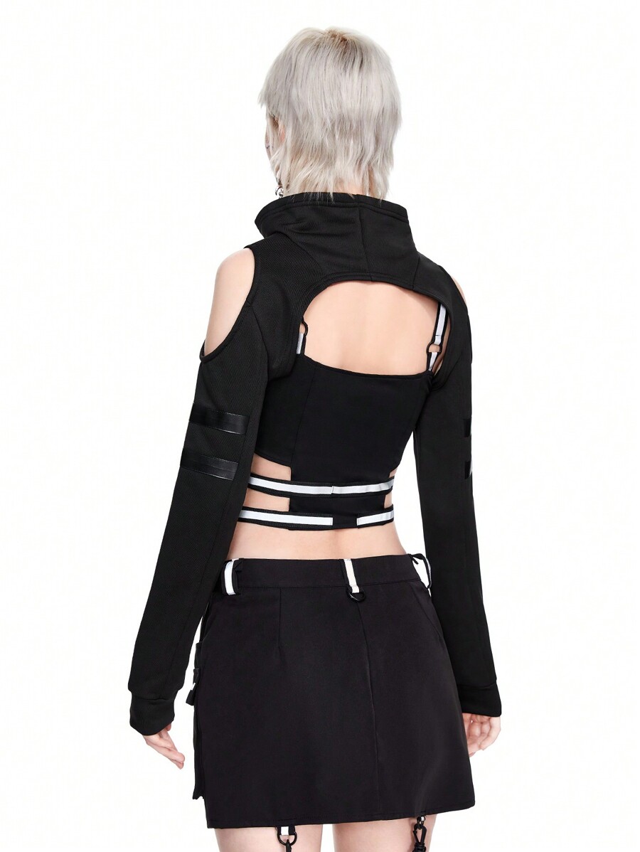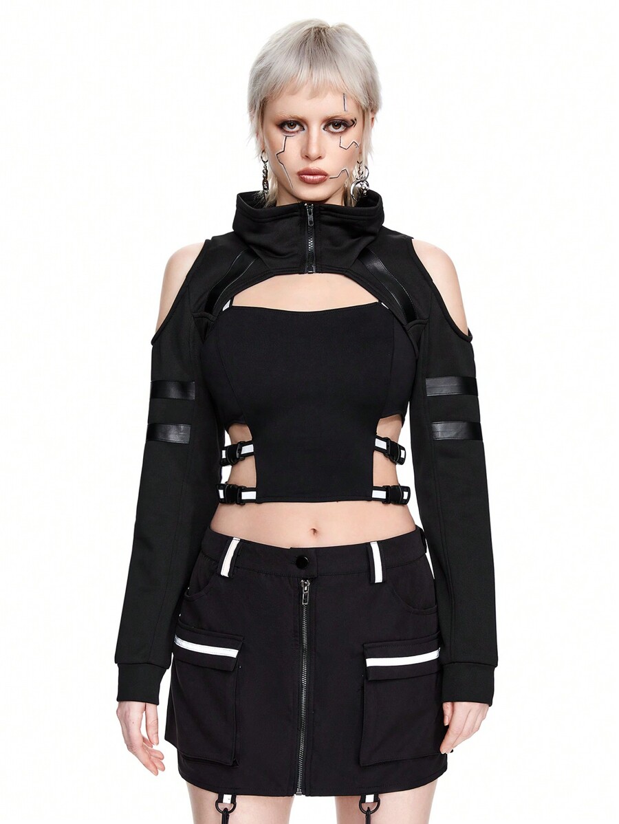 Grunge Punk Women Cargo Chic Faux Leather Webbing Decor Open Shoulder High Collar Cropped Zip-Up Jacket, Outerwear