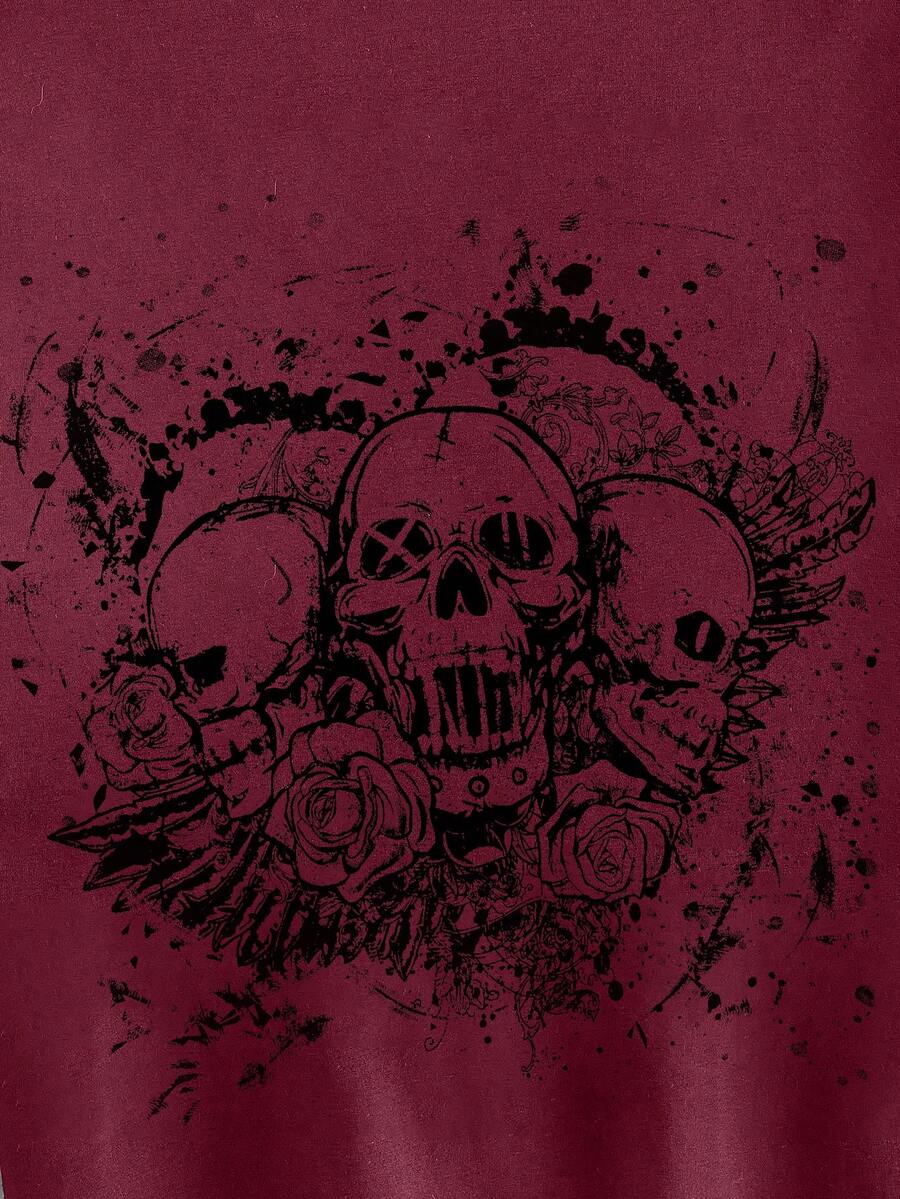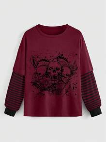 Grunge Punk Women Crew Neck Long Sleeve Skeleton Patchwork Loose T-Shirt, Casual Everyday Wear