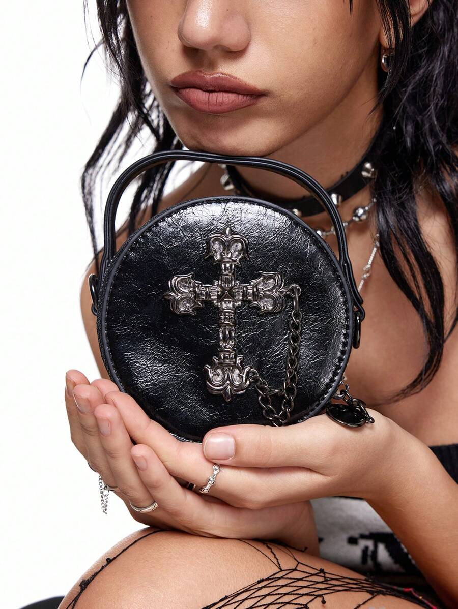 Grunge Punk Women Dark Gothic Style Round Tote Bag Punk Cross Body Shoulder Bag Mini Chain Crossbody Bag