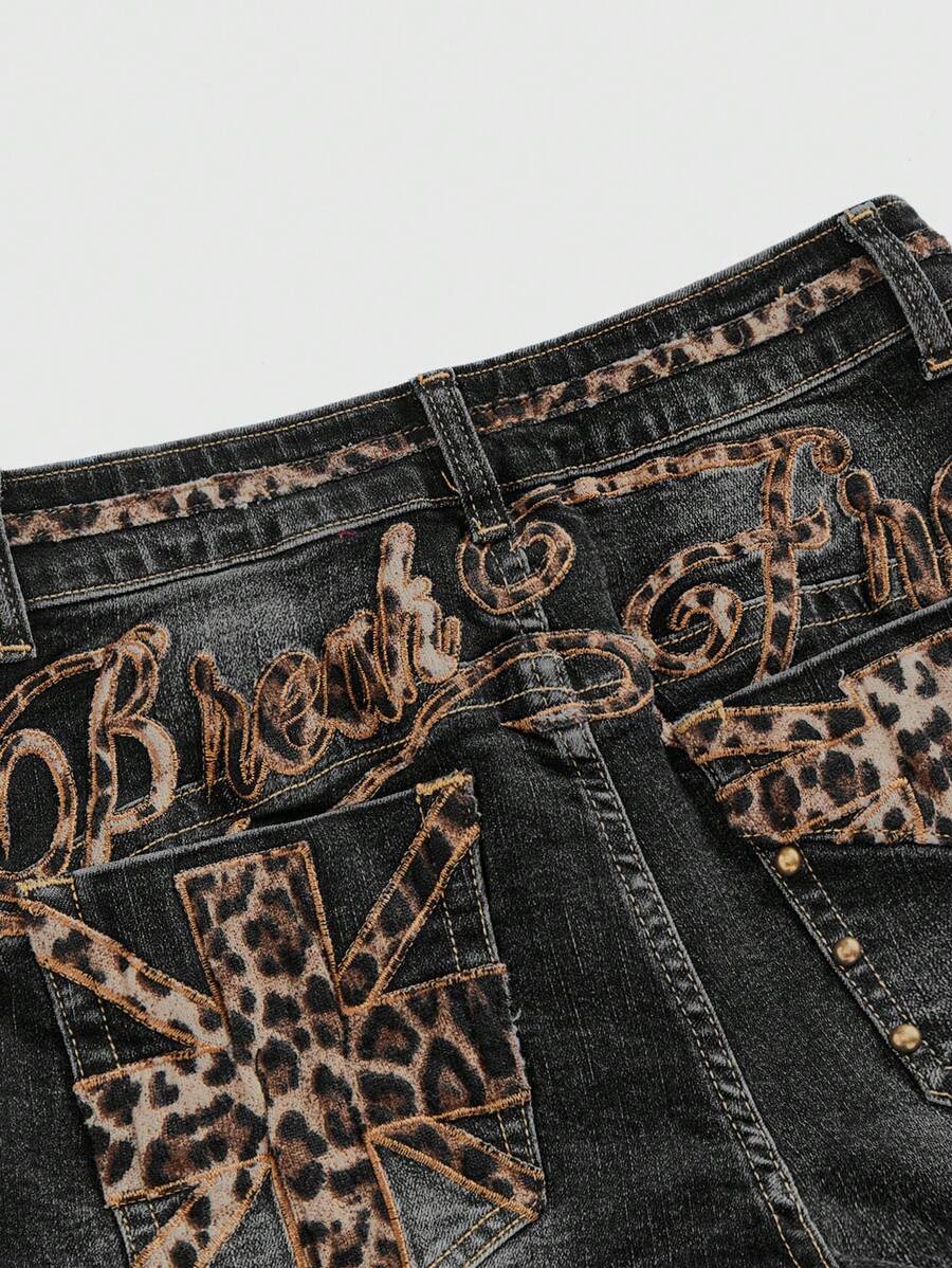 Grunge Punk Women Kpop Y2K Party Denim Shorts With Super Low Waist, Leopard Print Embroidery, Concert/Festival