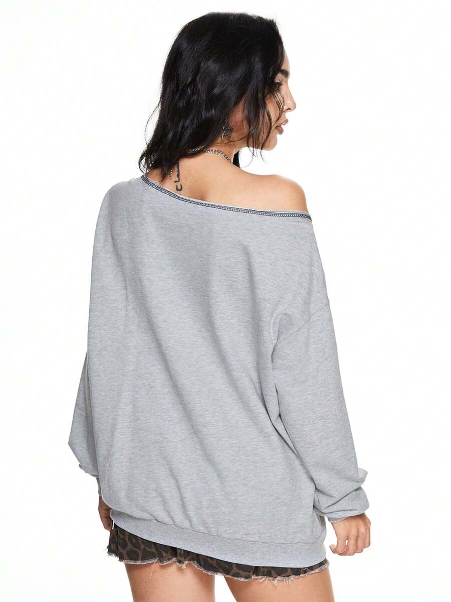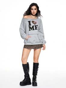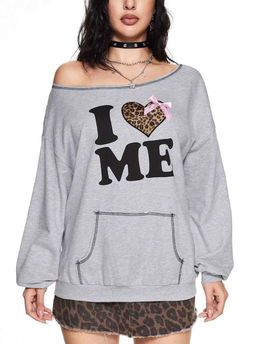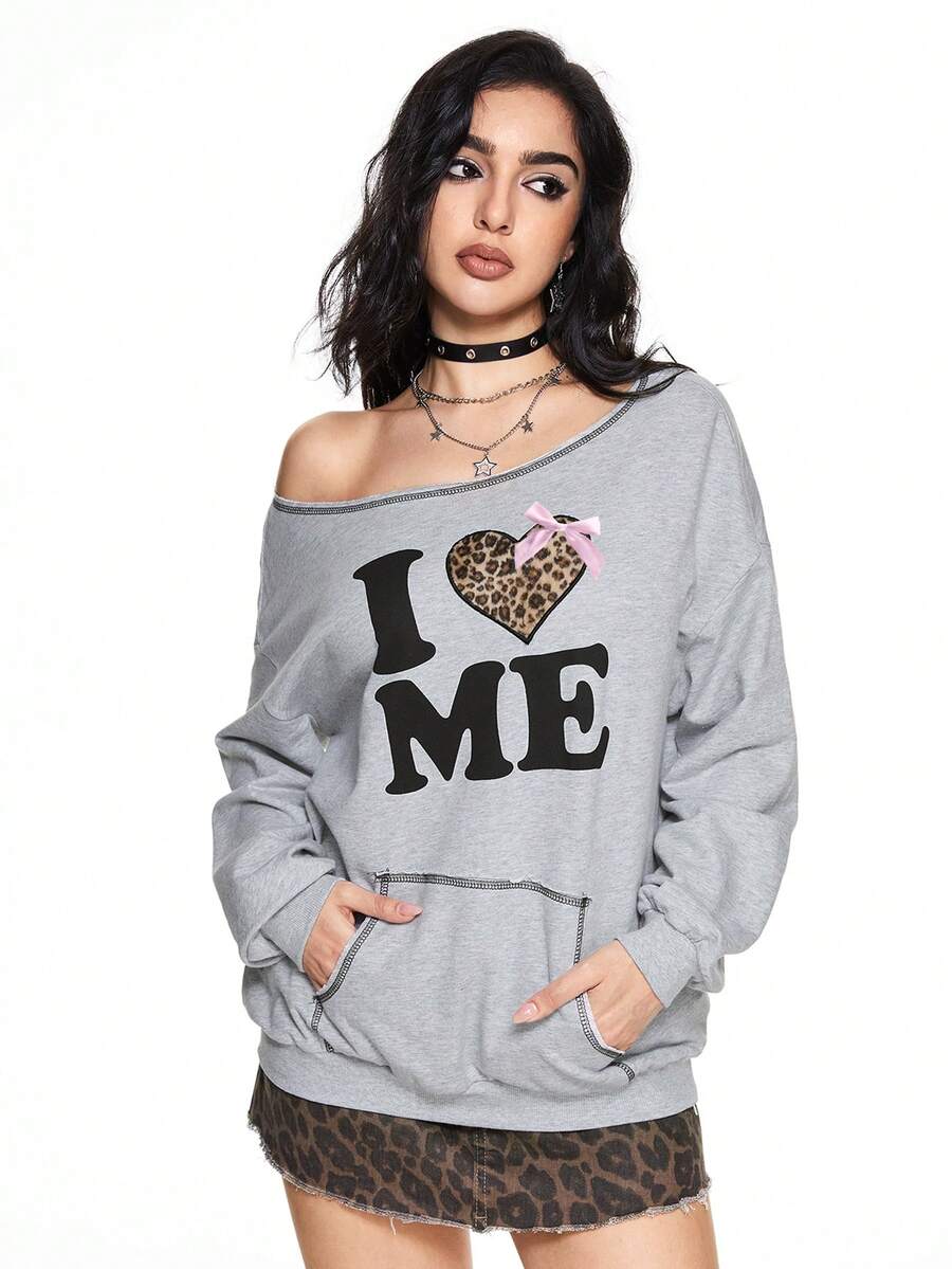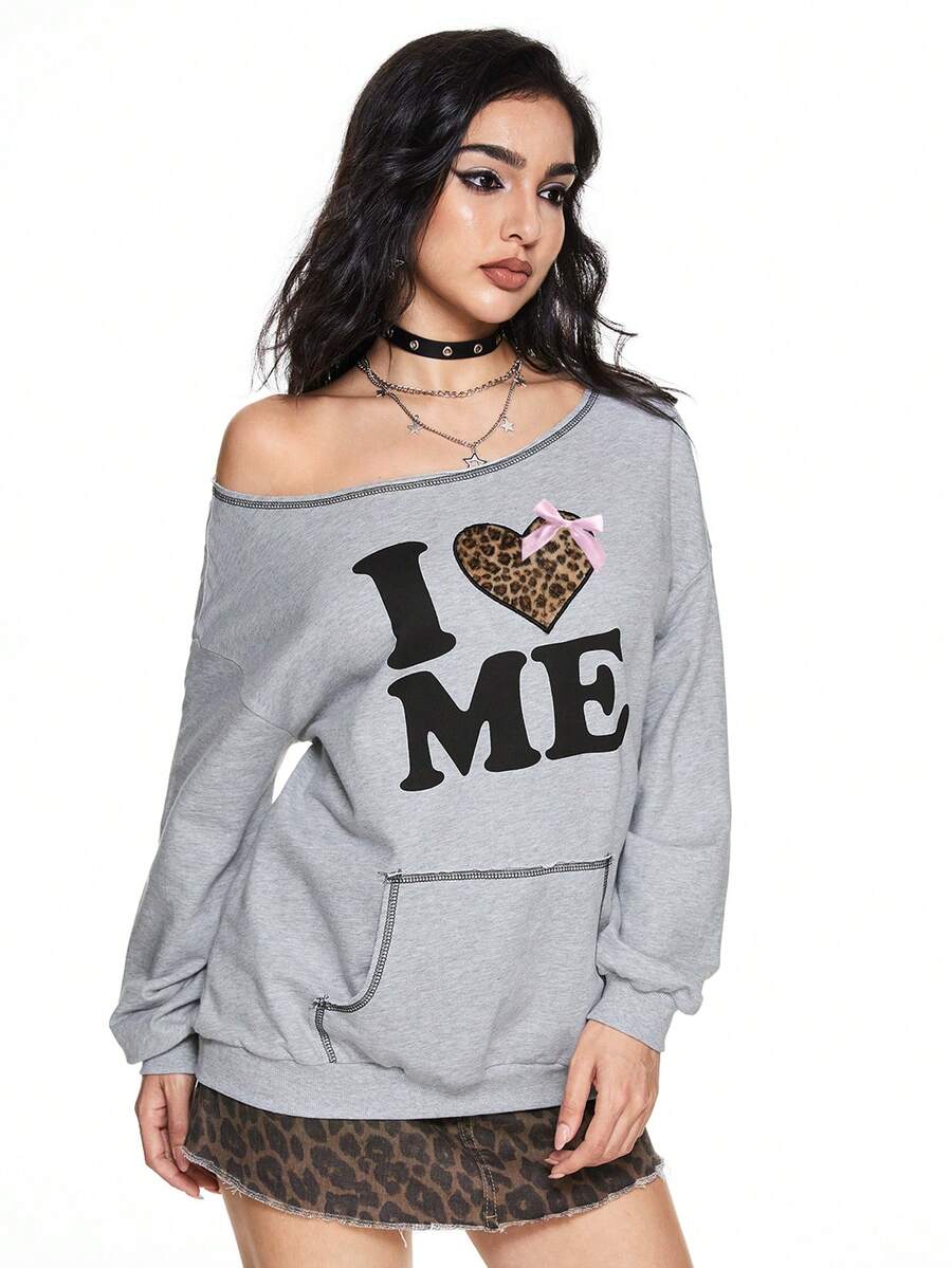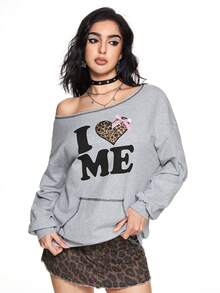 Grunge Punk Women Oblique Shoulder Retro Heart & Leopard Print, Fluffy Letter Graphic Bow Loose Sweatshirt, Cotton Blend