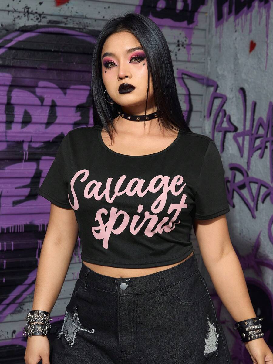Grunge Punk Women'S Plus Size Round Neck T-Shirt With Elasticity, Slogan Printed, Black & Pink Colorblock Design